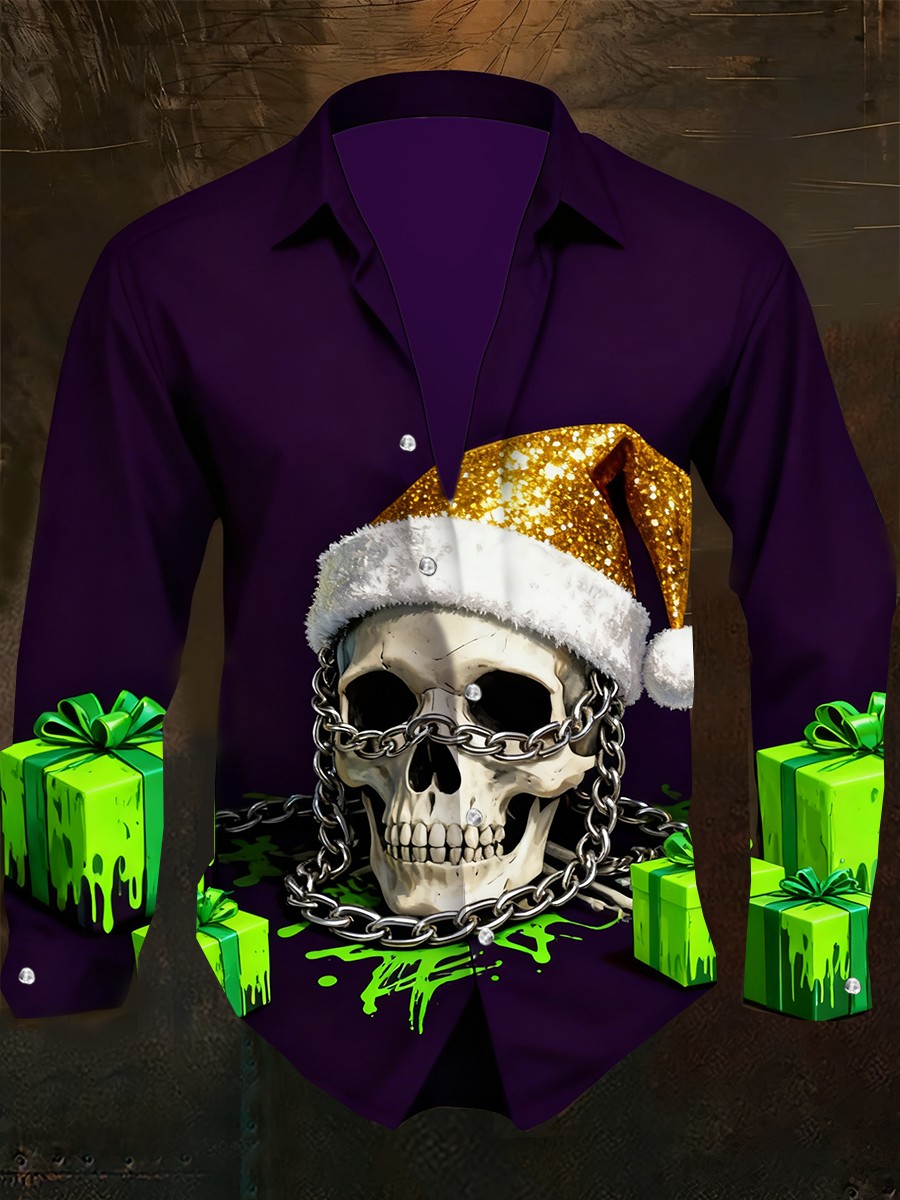 Men's Retro Punk Christmas Skull Chain Abstract Print Casual Long Sleeve Shirt