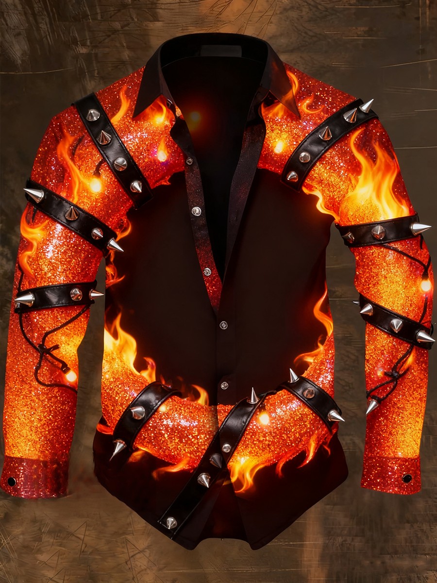 Men's Retro Punk Christmas Flame Studs Abstract Print Casual Long Sleeve Shirt