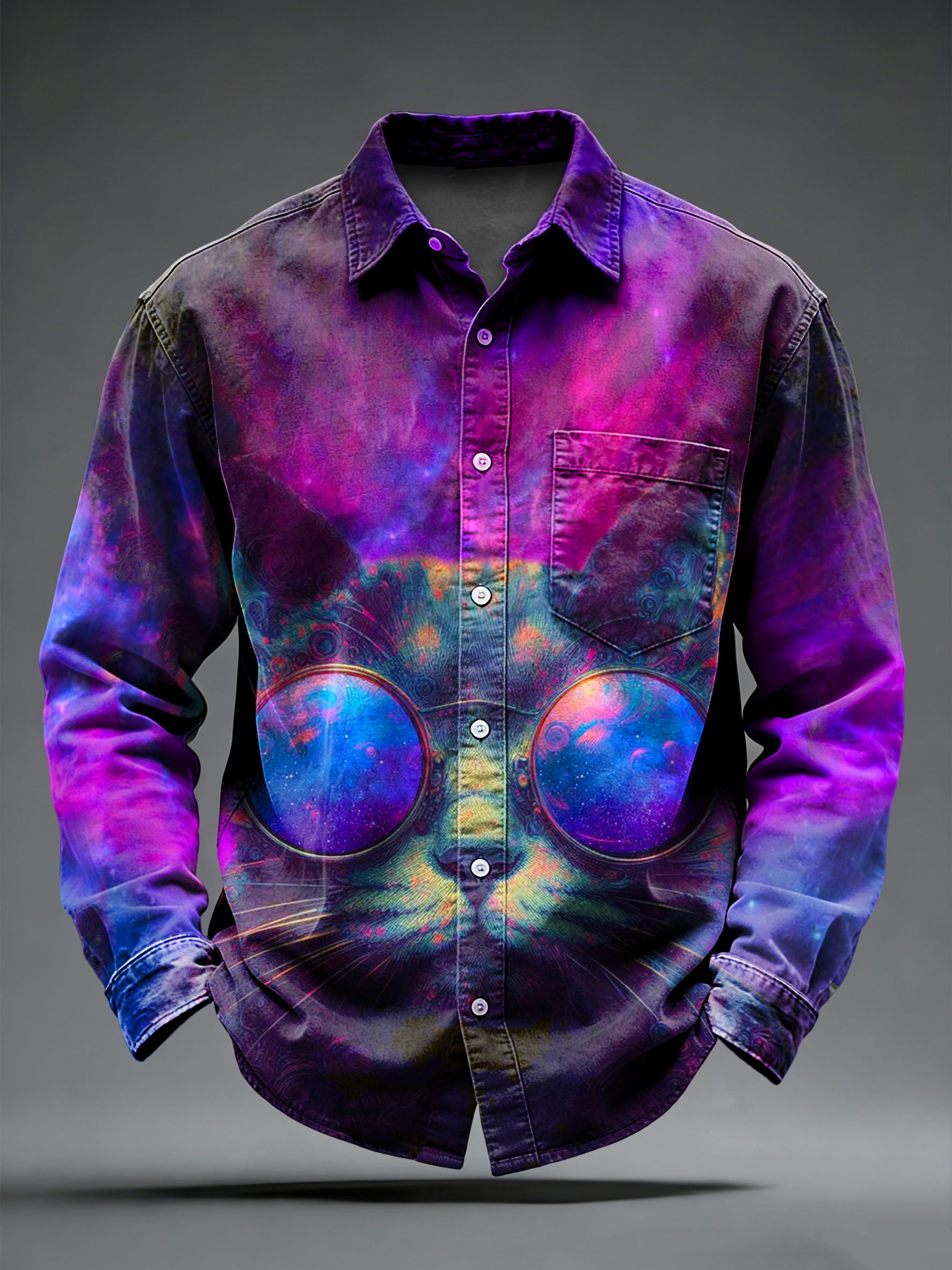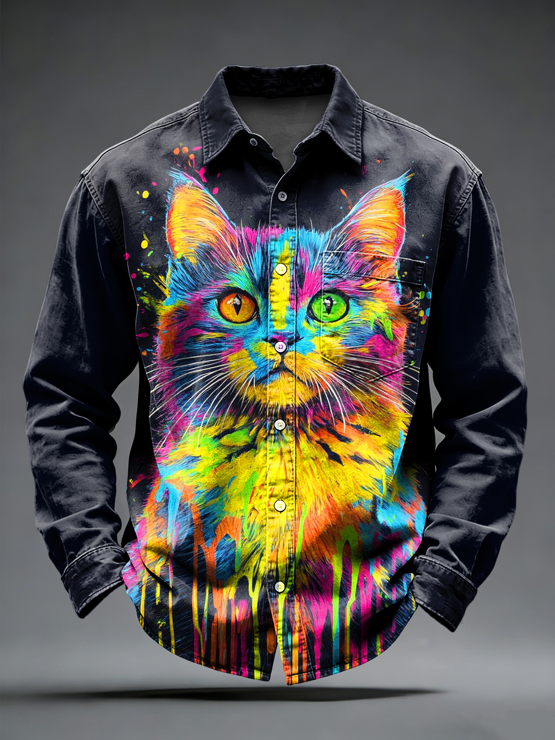 Men's Retro Psychedelic Punk Cat Printed Long Sleeved Pocket Shirt