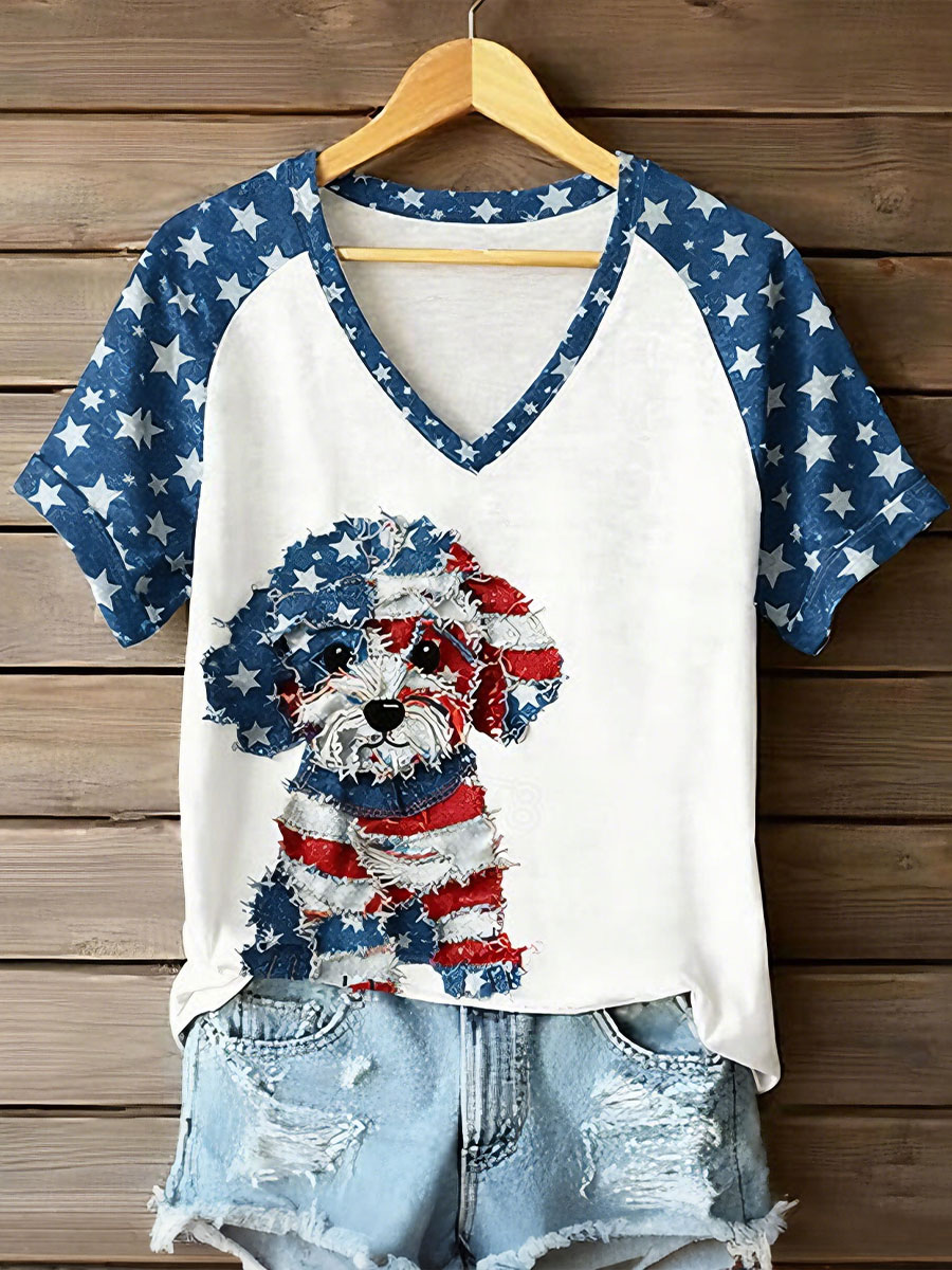 Women's American Flag Dog V-Neck T-Shirts