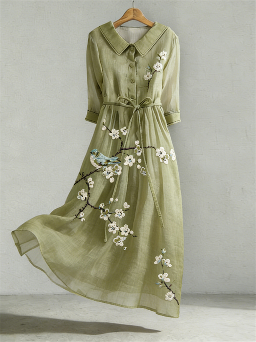 Women's Floral and Bird Embroidery Pattern Linen Blend Dress