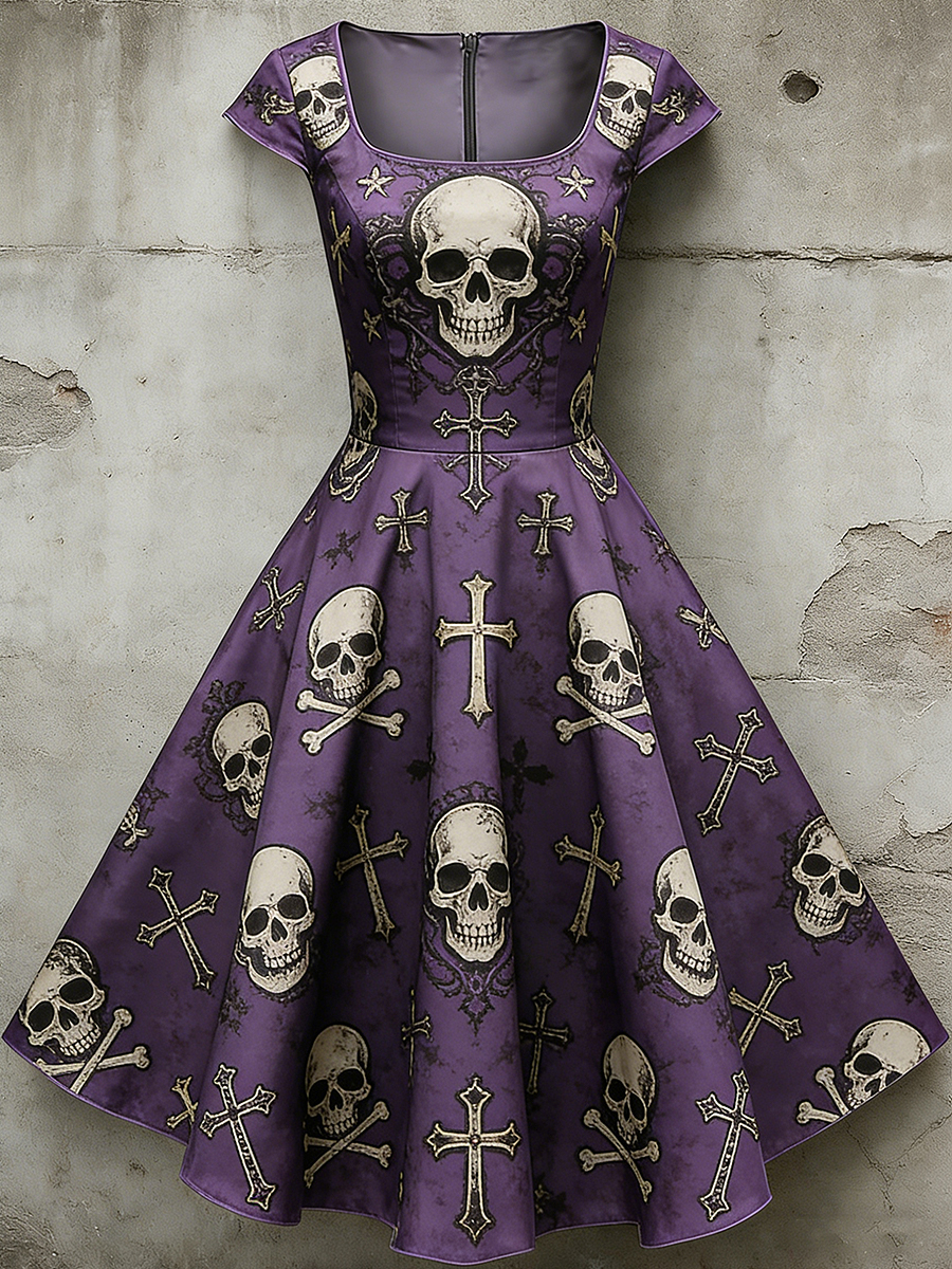 Women's Casual U-Shaped Collar Short Sleeve Gothic Skull Print Short Sleeve Dress