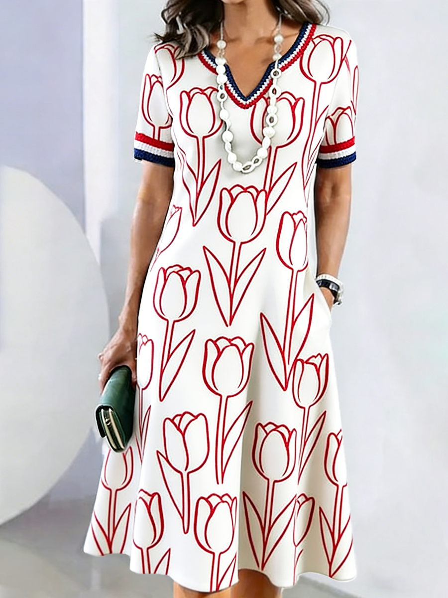 Women’s Tulip Print Mother’s Day Gift Casual V-neck Dress