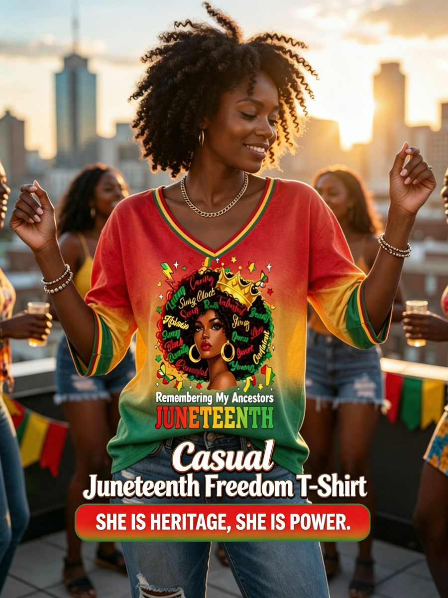 Women's Juneteenth Freedom Gradient V-Neck Art Casual T-Shirt