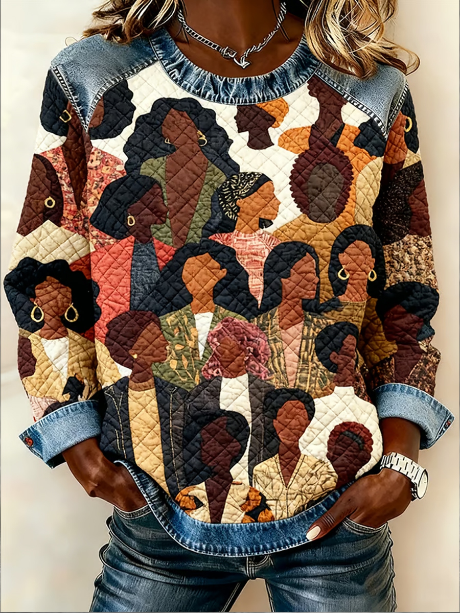 Women's Black Women Portrait Art Print Denim Patchwork Top