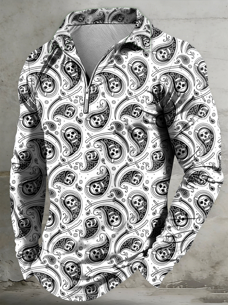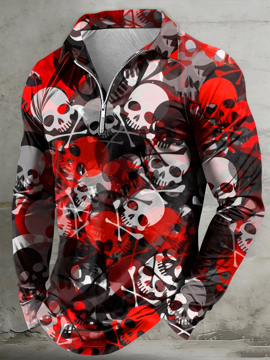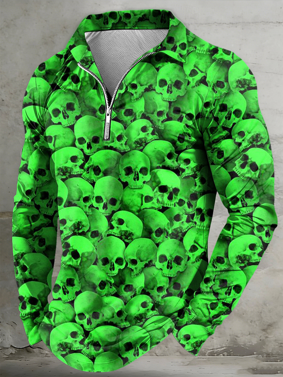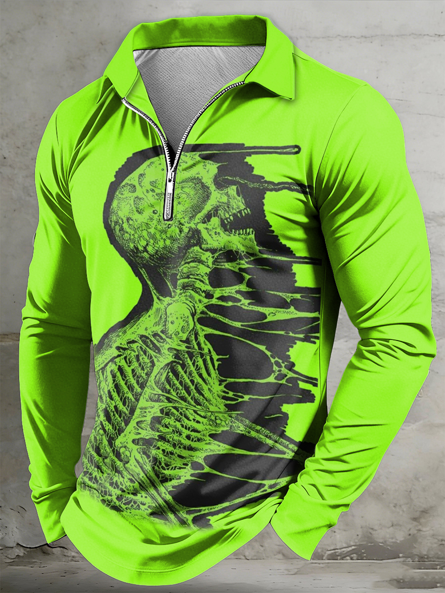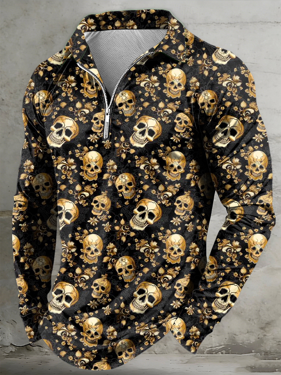 Men's Skull Printed Half Zipper Lapel Long Sleeved Polo