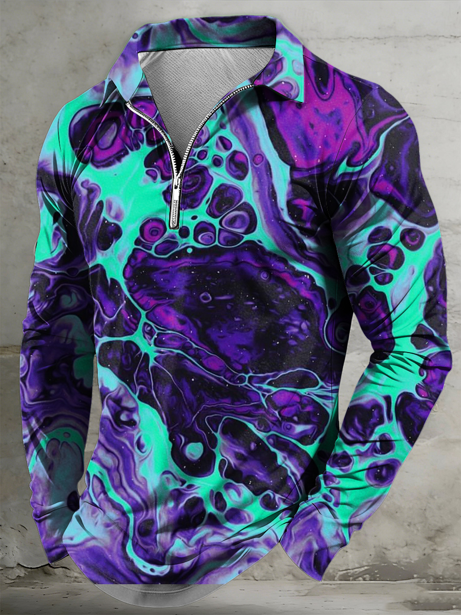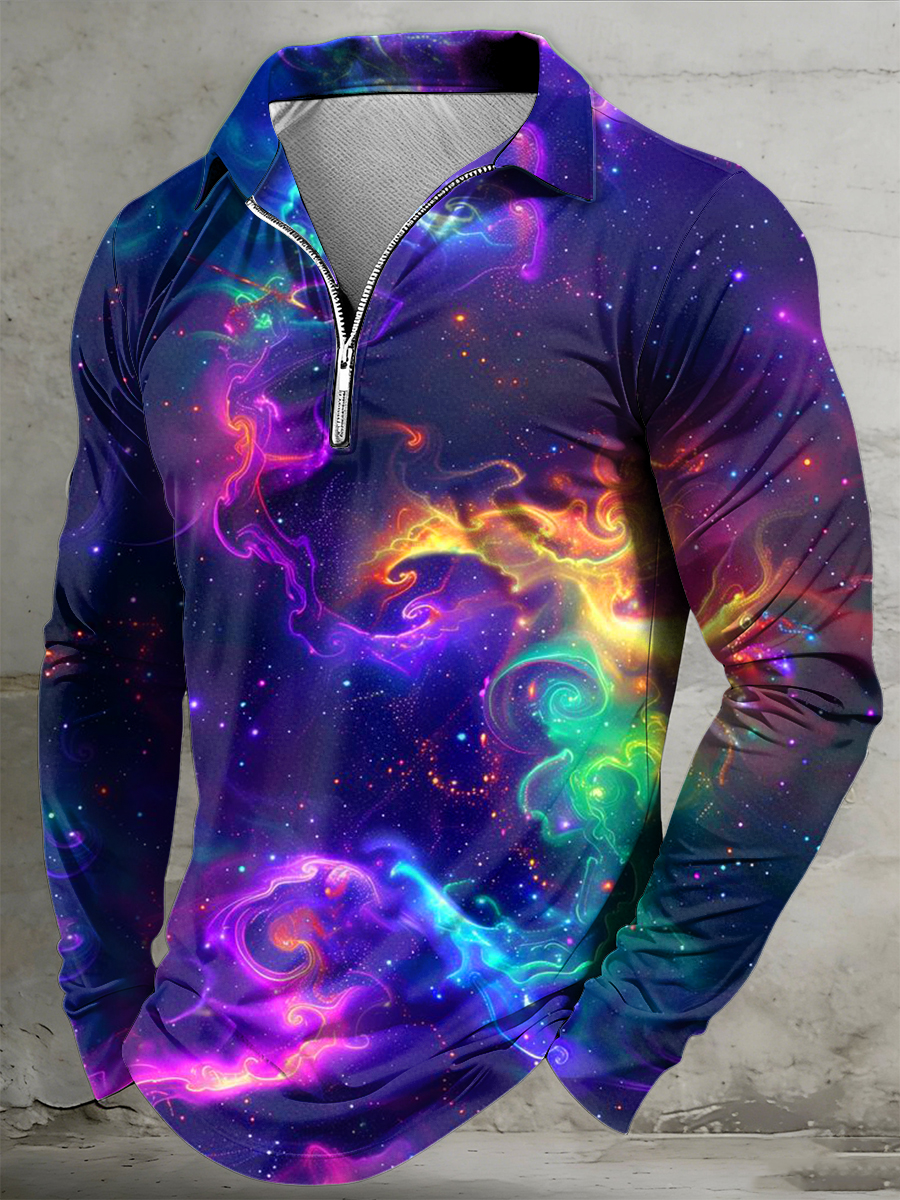 Men's Psychedelic Starry Sky Printed Half Zipper Lapel Long Sleeved Polo
