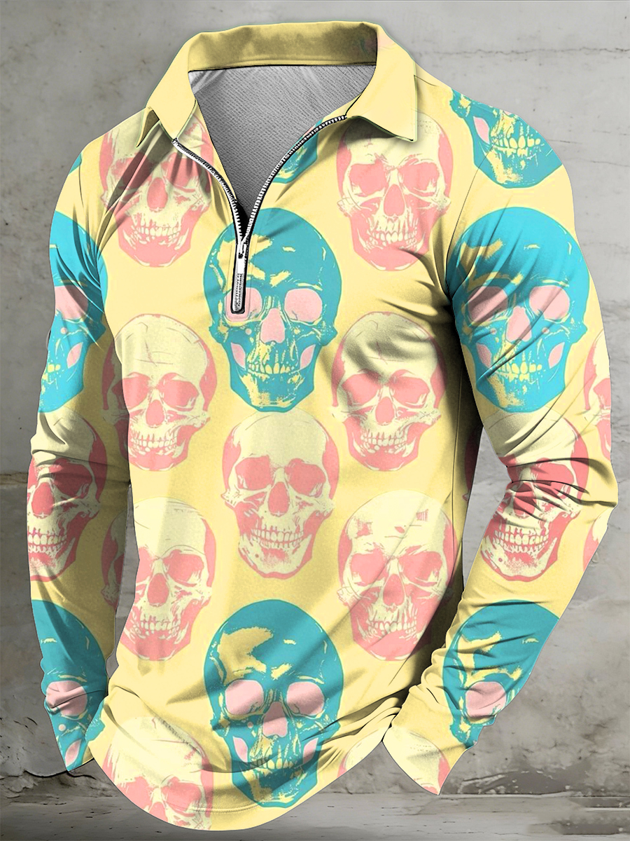 Men's Psychedelic Skull Printed Half Zipper Lapel Long Sleeved Polo