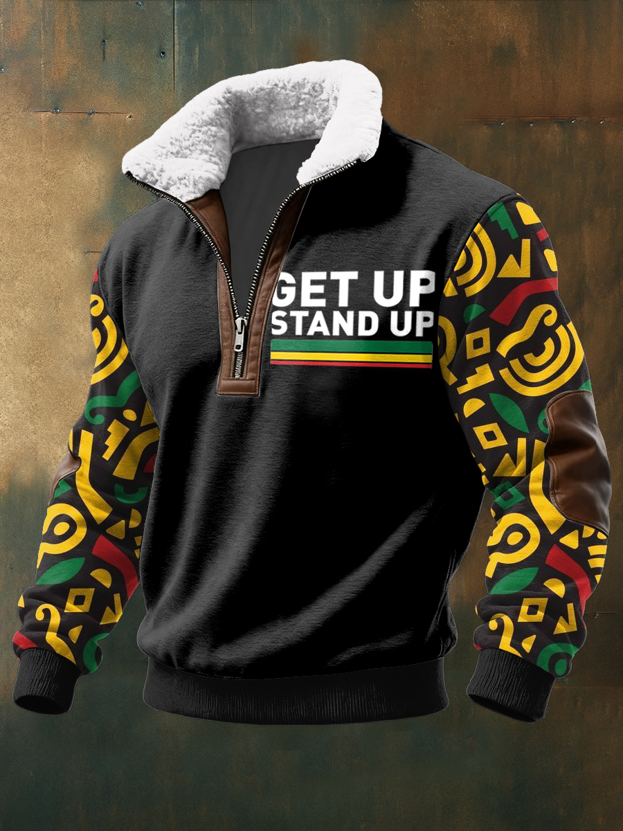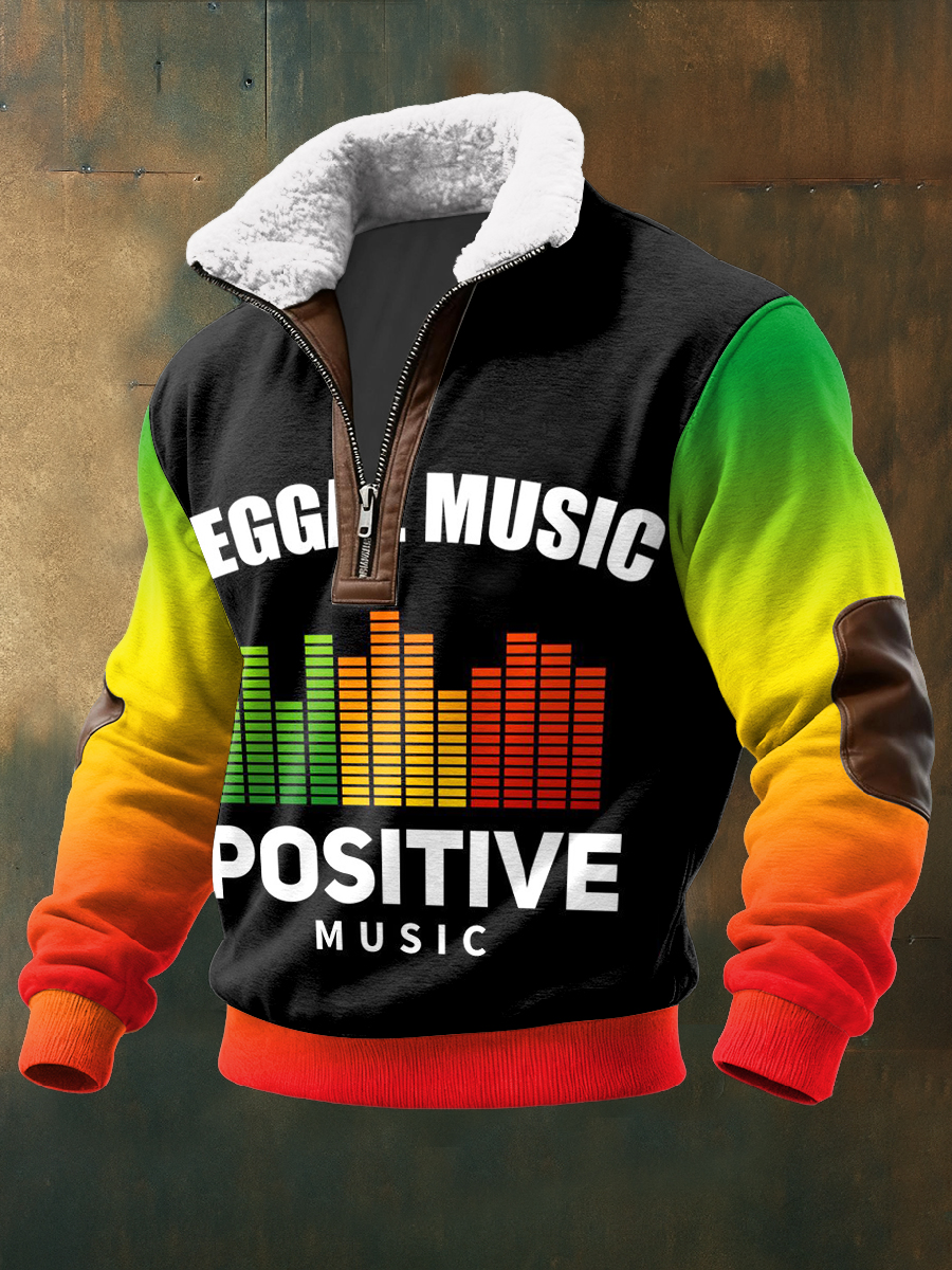 Men's Reggae Printed Long Sleeved Stand Up Collar Lambhair Zipper Top