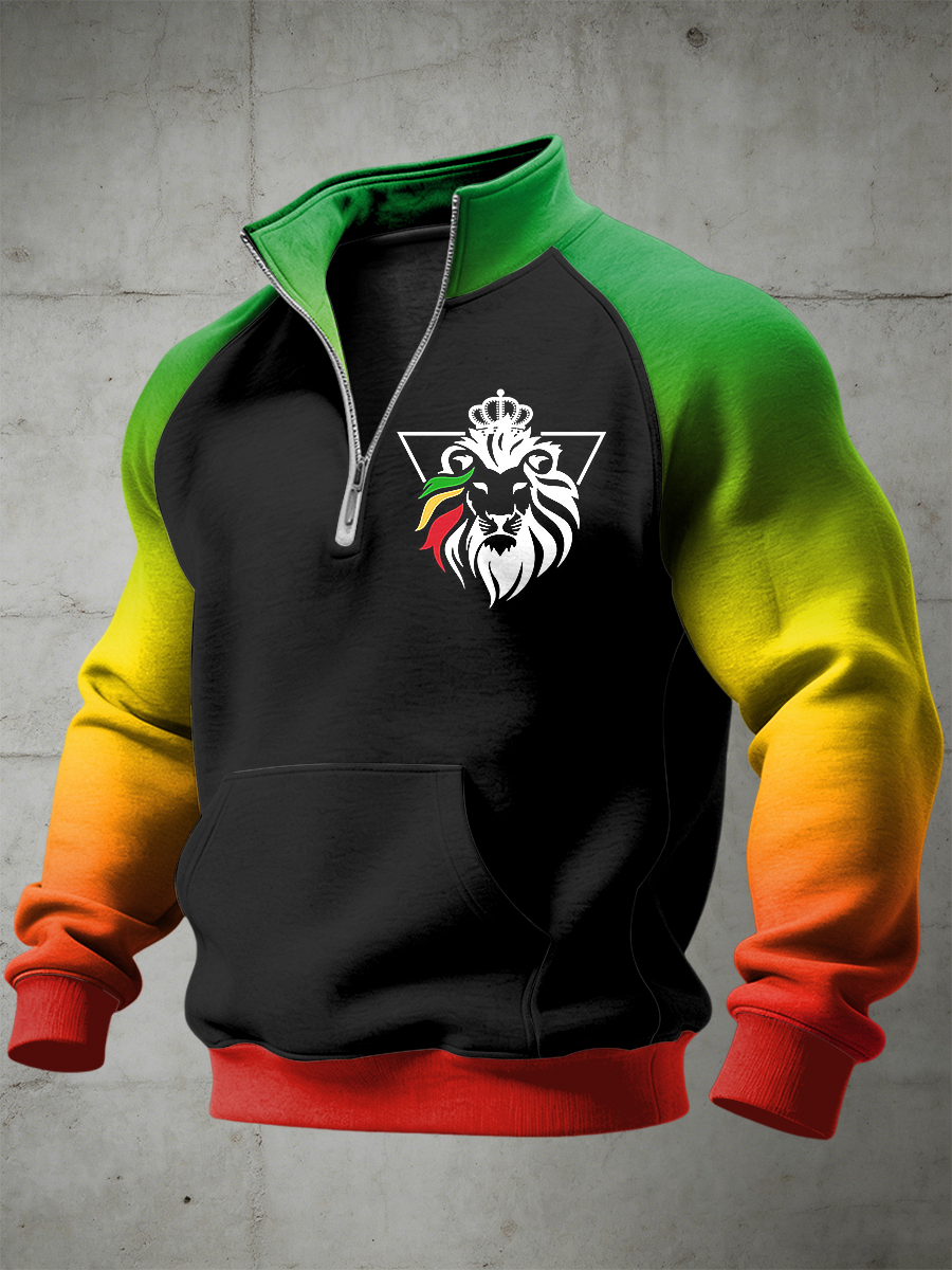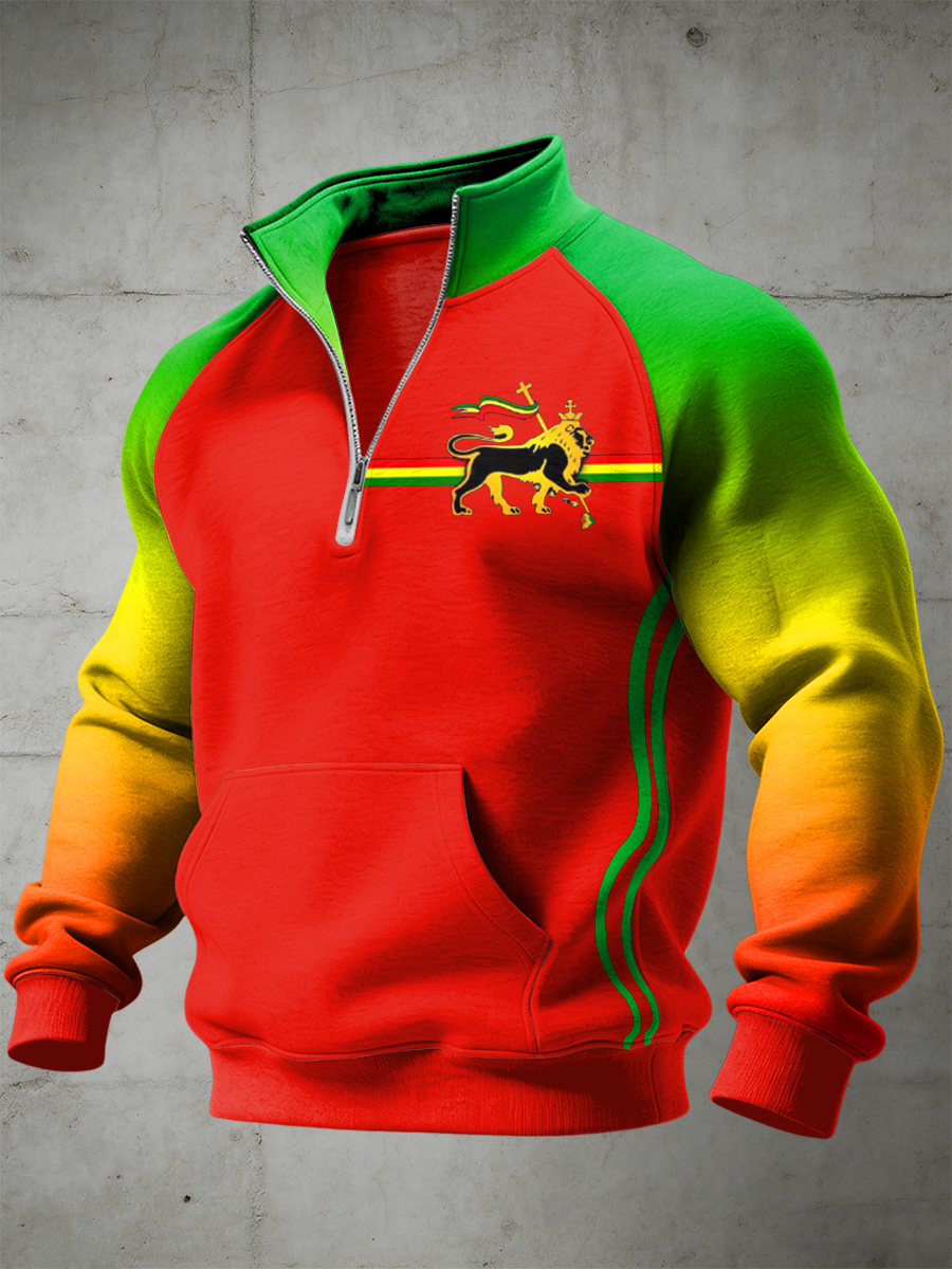 Men's Reggae Printed Half Zip Stand Up Collar With Raglan Sleeves Sweatshirt