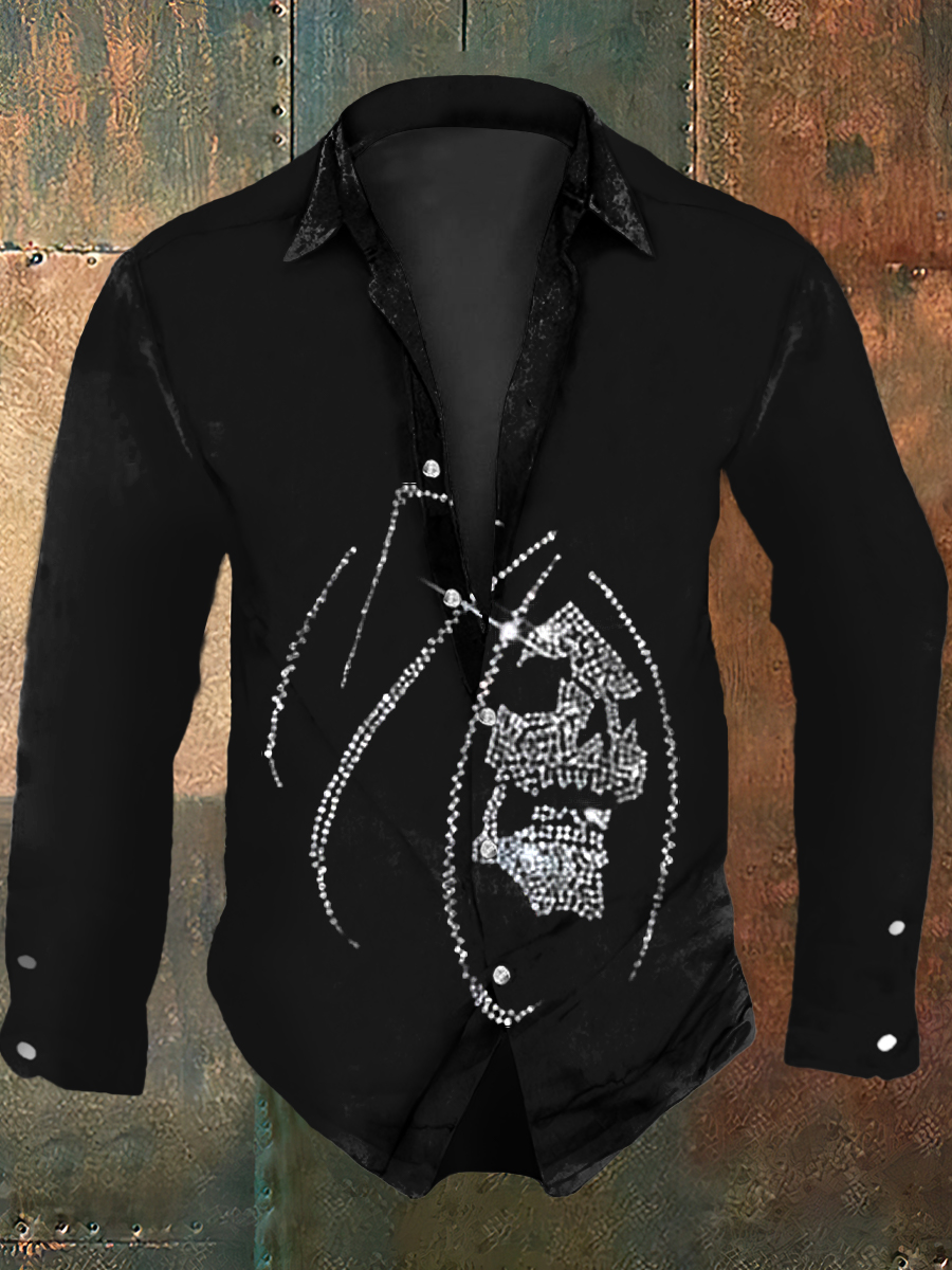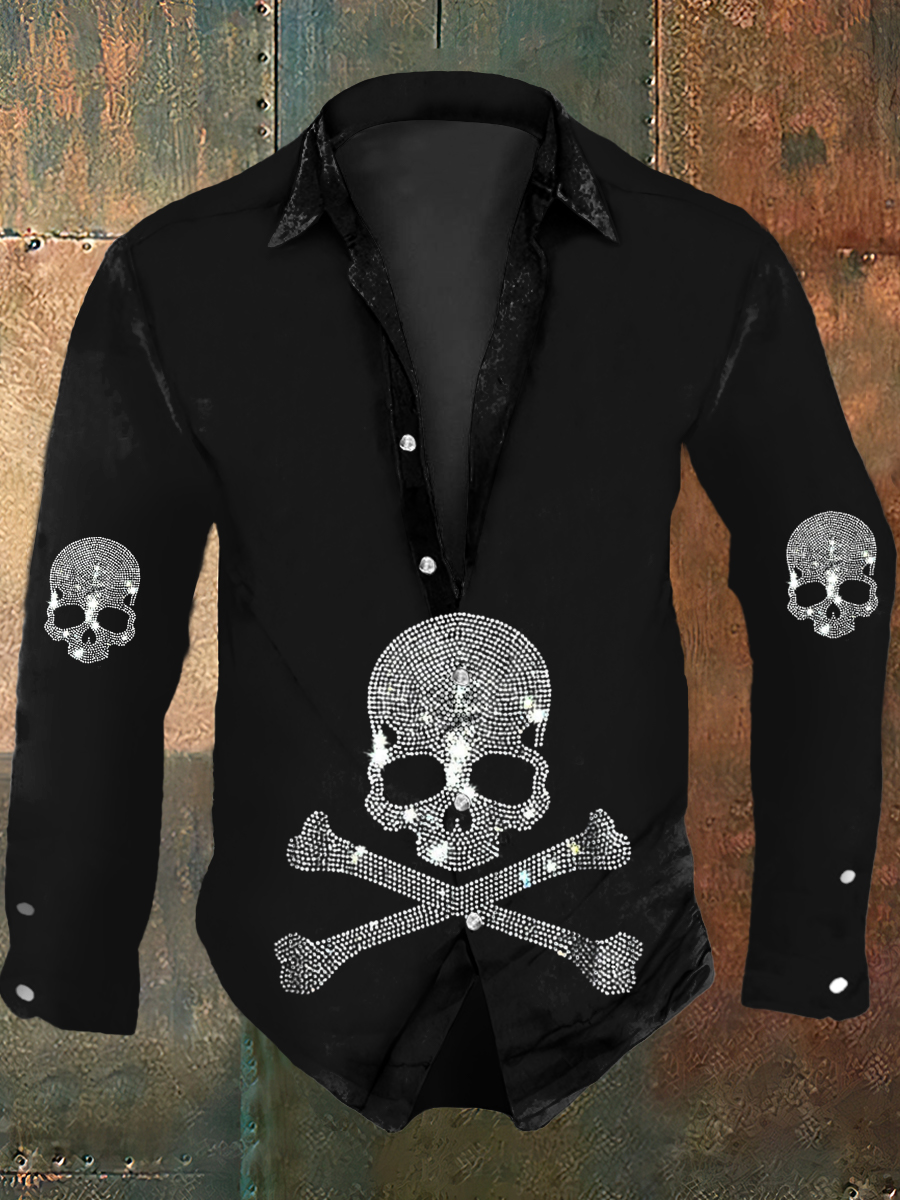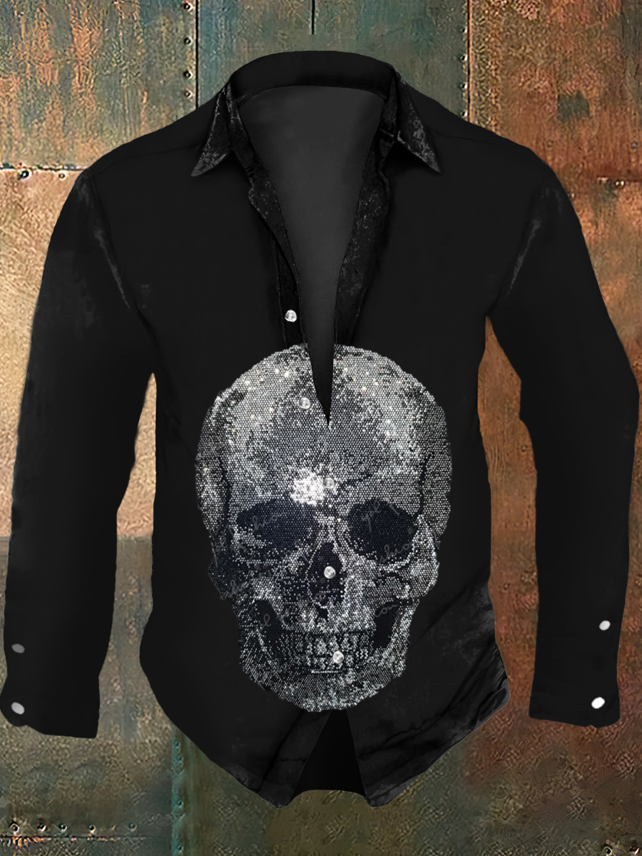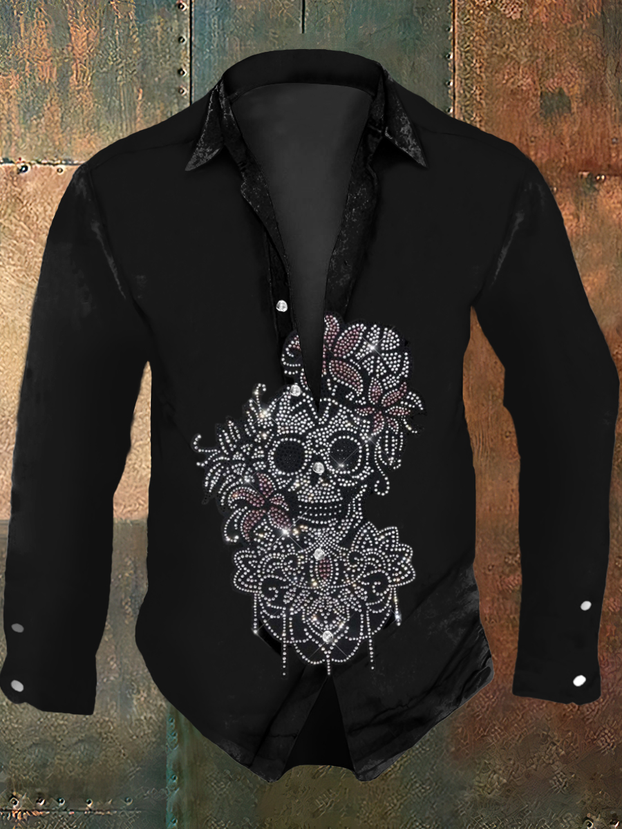 Men's Retro Halloween Party Sparkling Rhinestone Skull Abstract Print Casual Long Sleeve Shirt