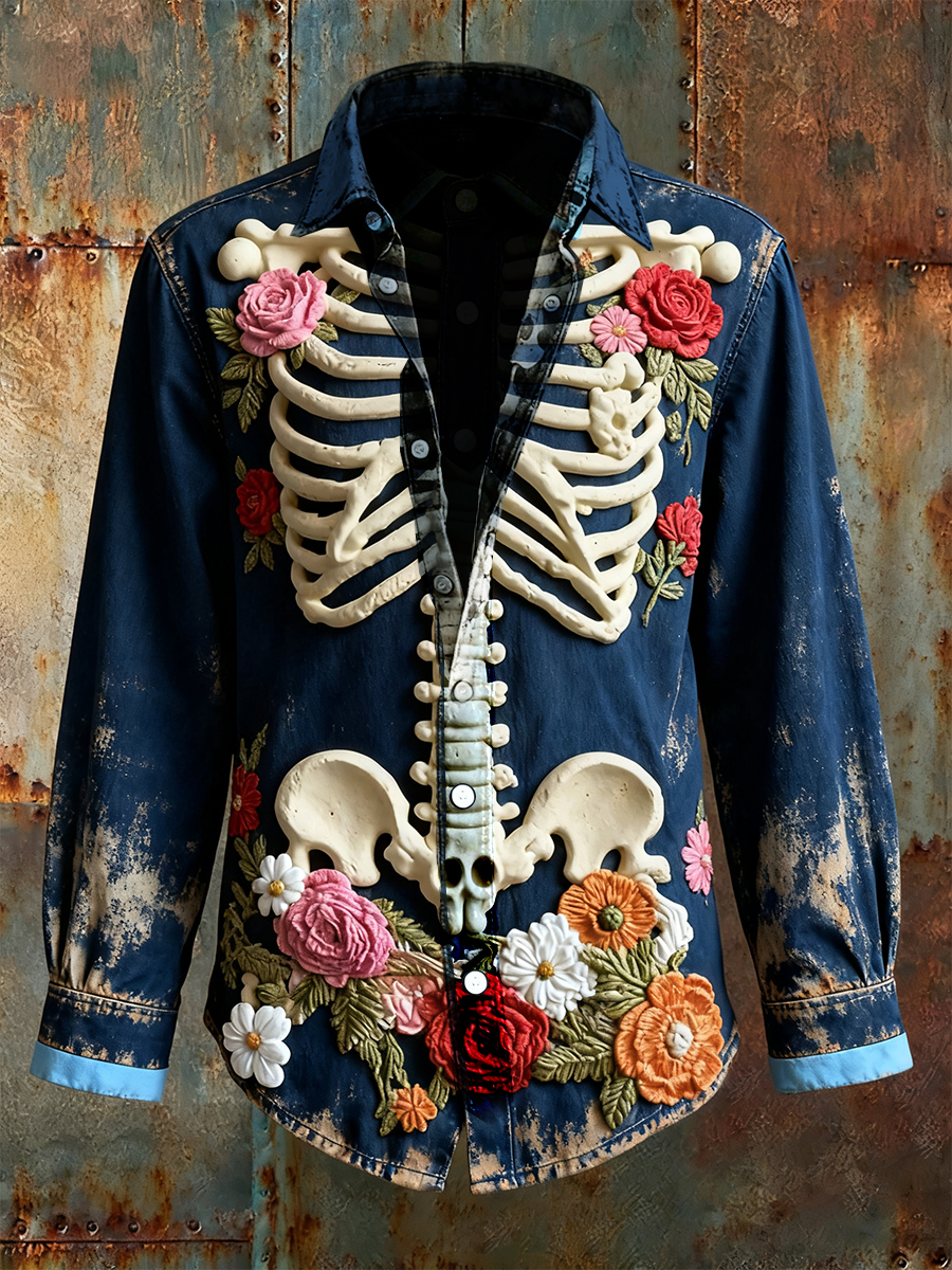 Men's Retro Punk Halloween Skull Floral Skeleton Abstract Print Casual Long Sleeve Shirt