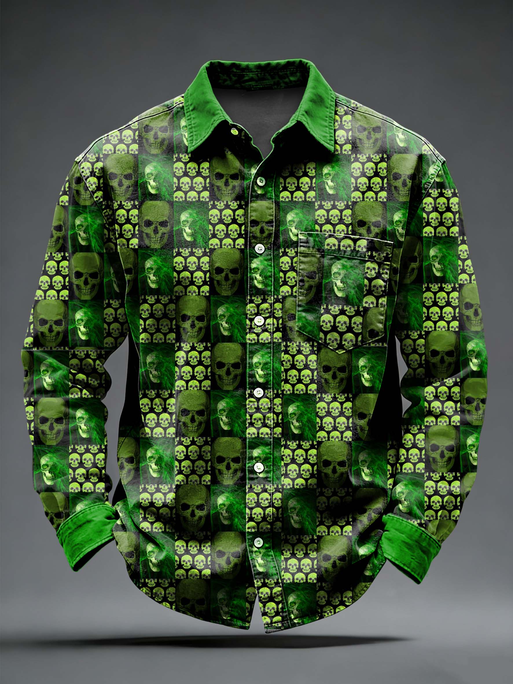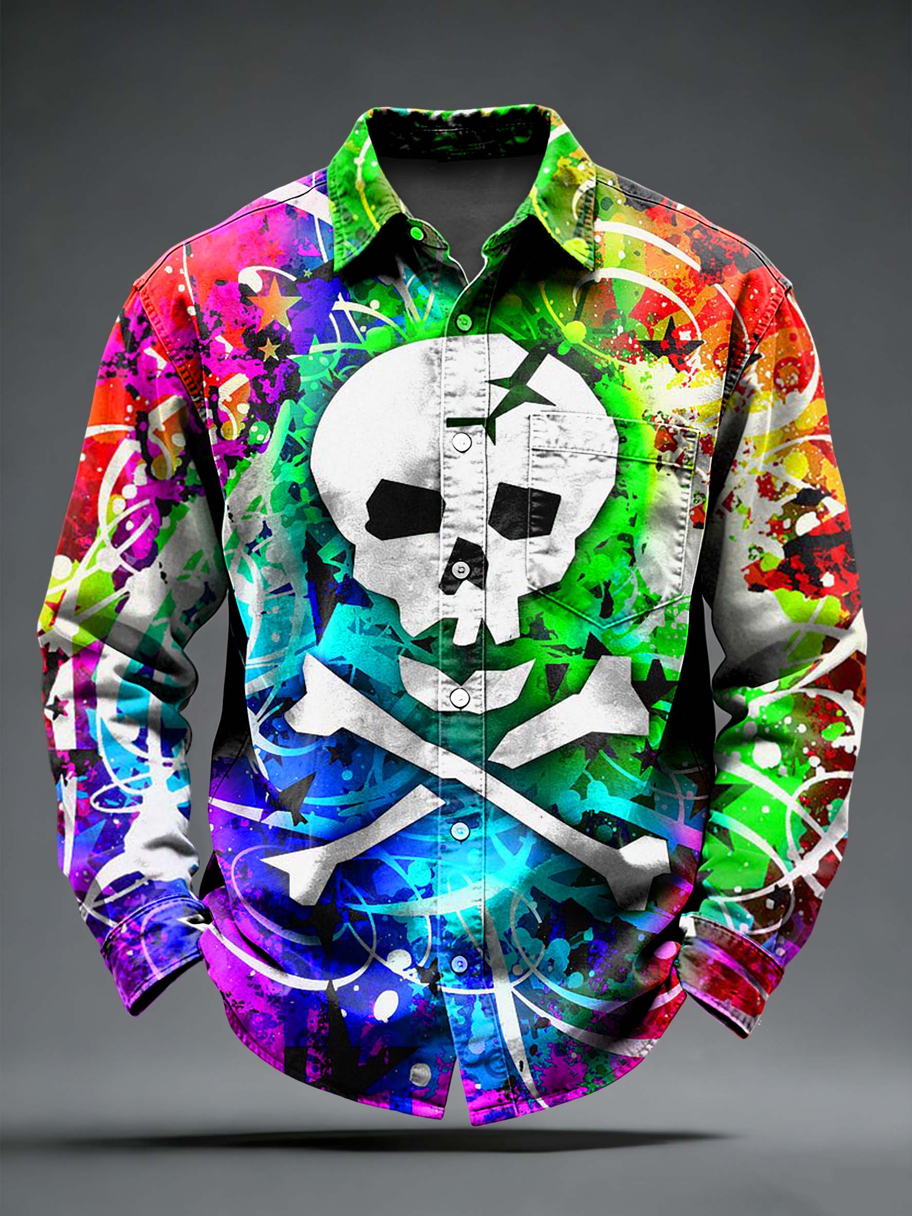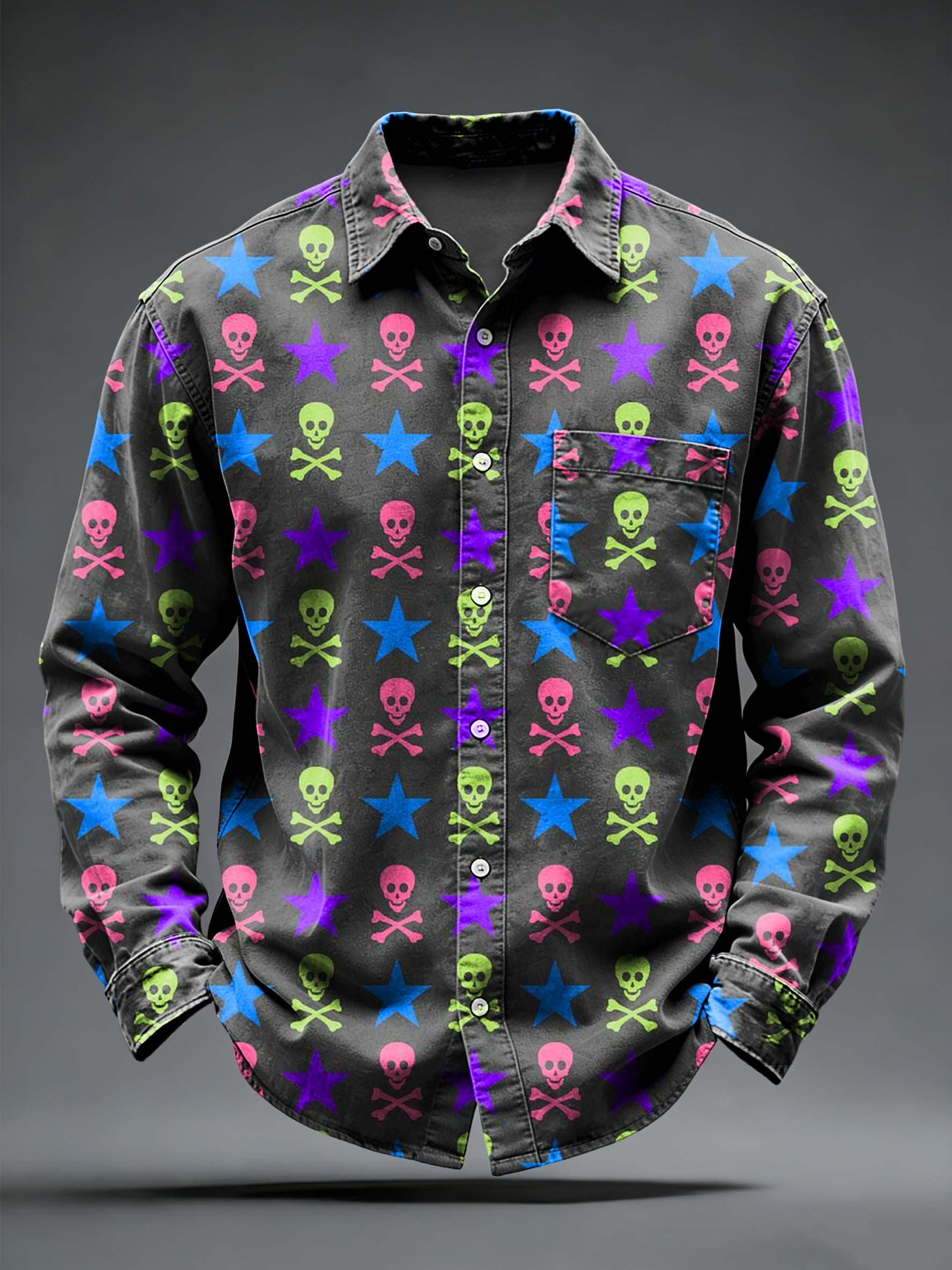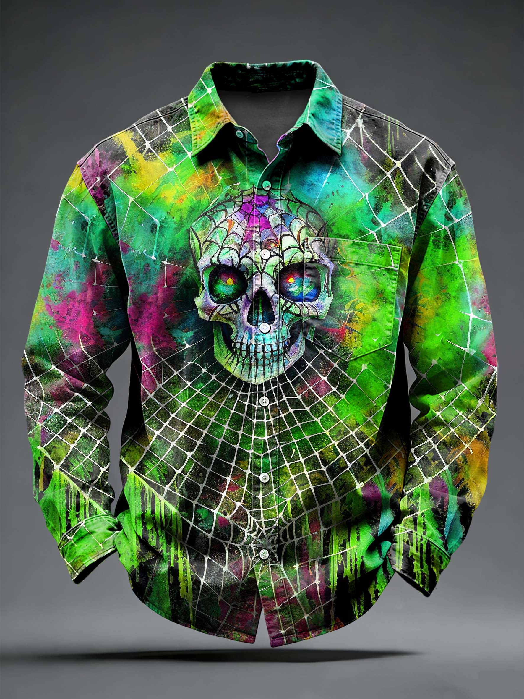 Men's Retro Punk Psychedelic Skull Printed Long Sleeved Pocket Shirt