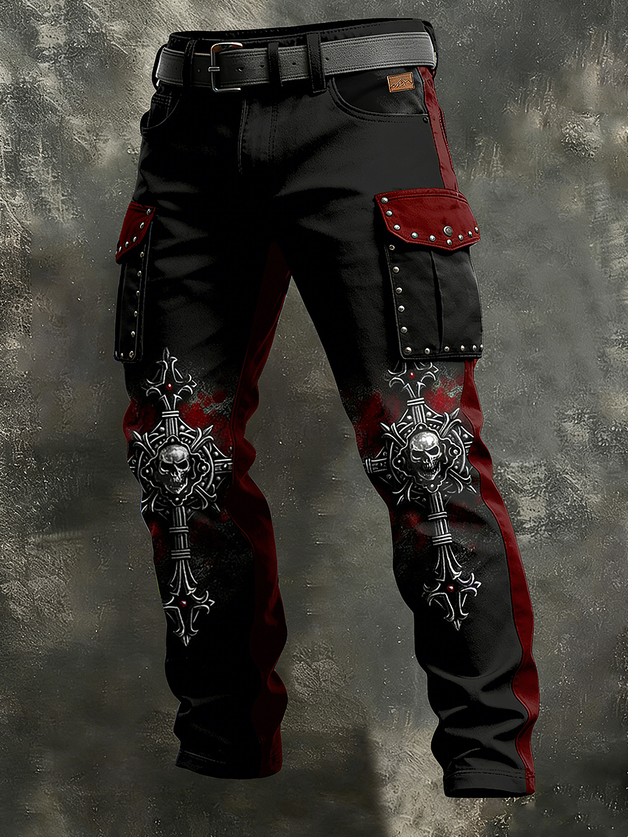 Men's Retro Vacation Business Punk Cross Skull Art Print Casual Workwear Trousers