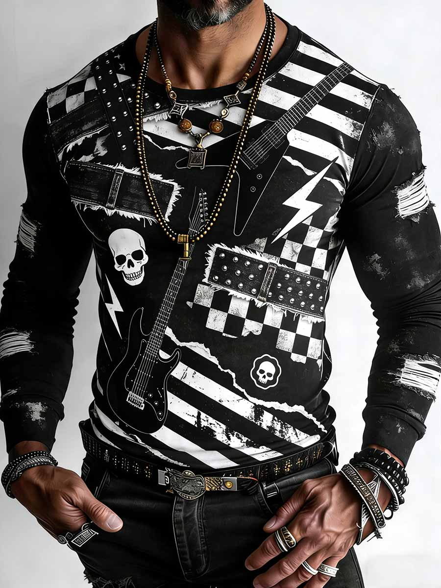 Men's Retro Punk Music Skull Printed Long Sleeved Pocket Shirt