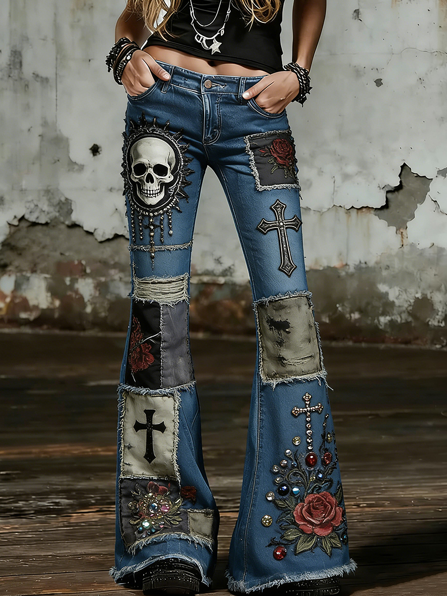 Women's Vintage Punk Rock Skull Cross Patchwork Print Comfortable Pants