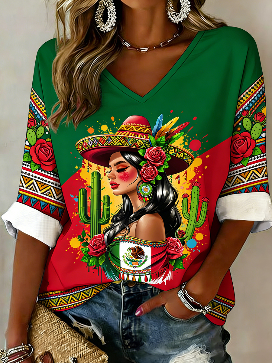 Women's May 5th Festival Ethnic Style Printed Casual V-Neck Top