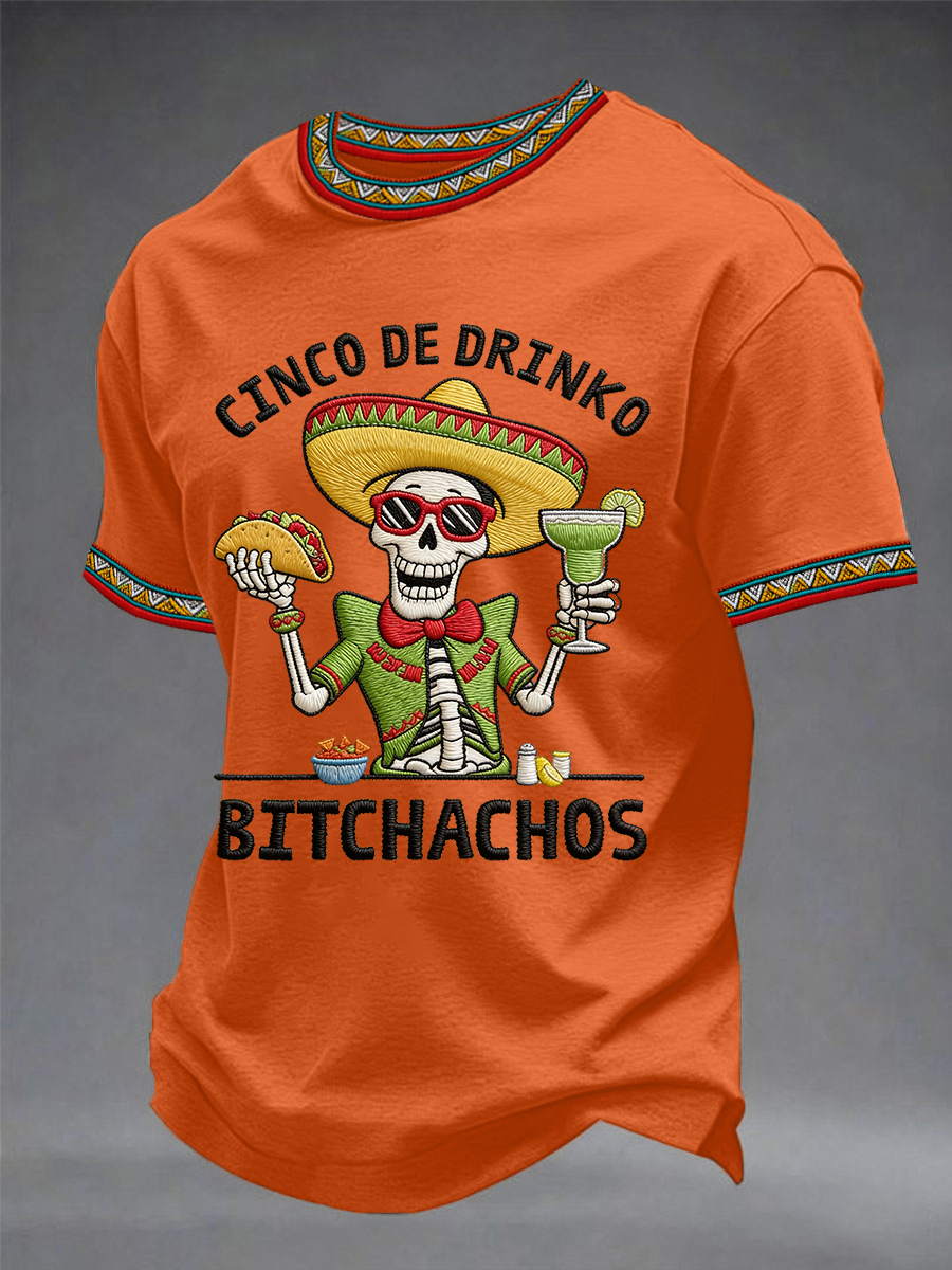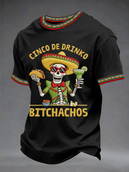 Men's Cinco De Drinko Bitchachos Skeleton Mexican Fiesta Print Casual Tee