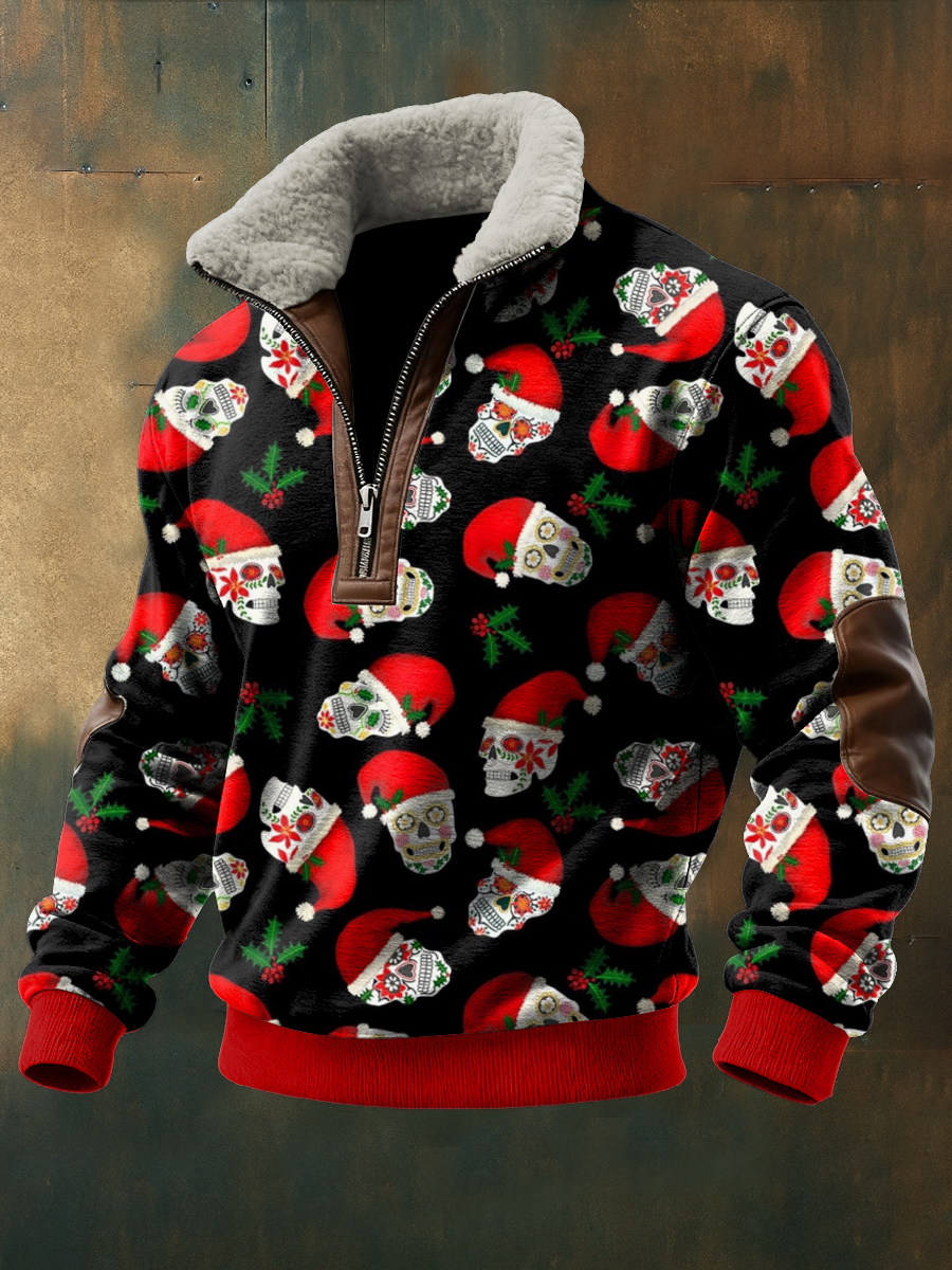 Men's Christmas Skull Printed Long Sleeved Stand Up Collar Lambhair Zipper Top