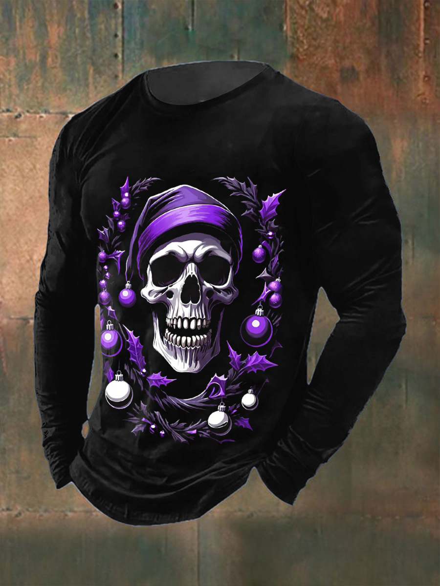 Men's Gothic Christmas Skull Printed Long Sleeved Round Neck T-shirt