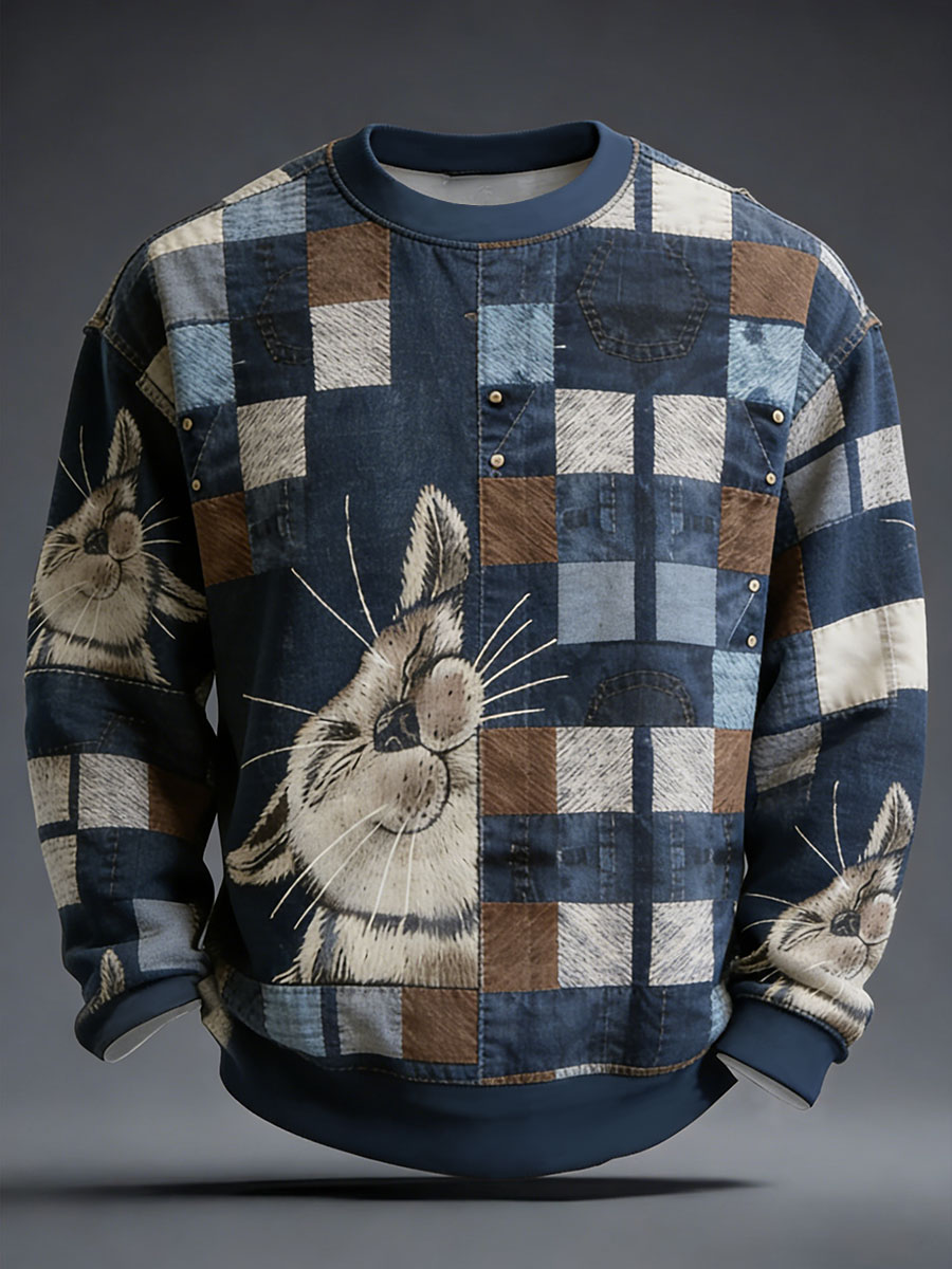 Men's Plaid Cat Patchwork Print Crew Neck Sweatshirt