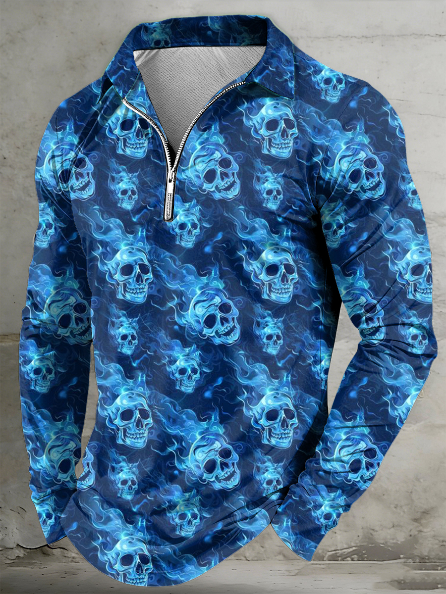 Men's Psychedelic Skull Printed Half Zipper Lapel Long Sleeved Polo