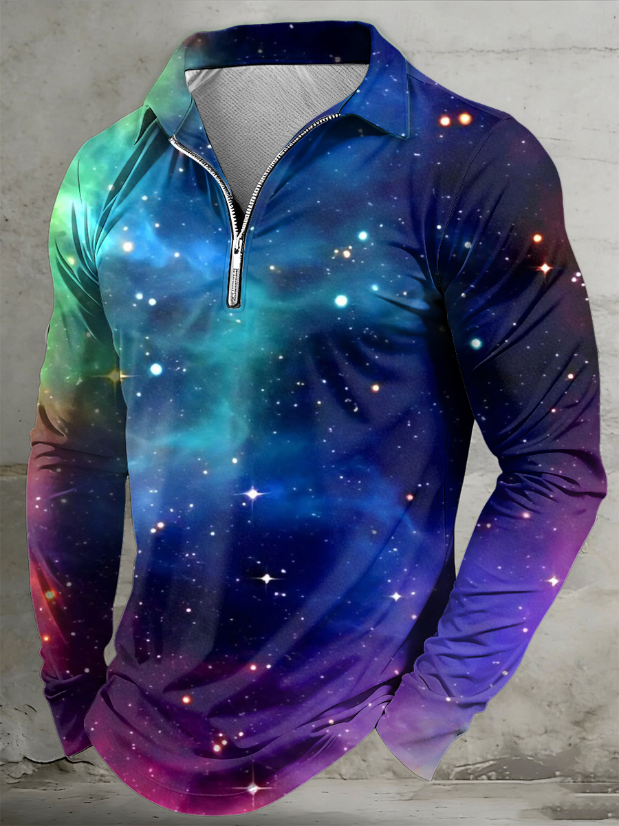Men's Psychedelic Starry Sky Printed Half Zipper Lapel Long Sleeved Polo