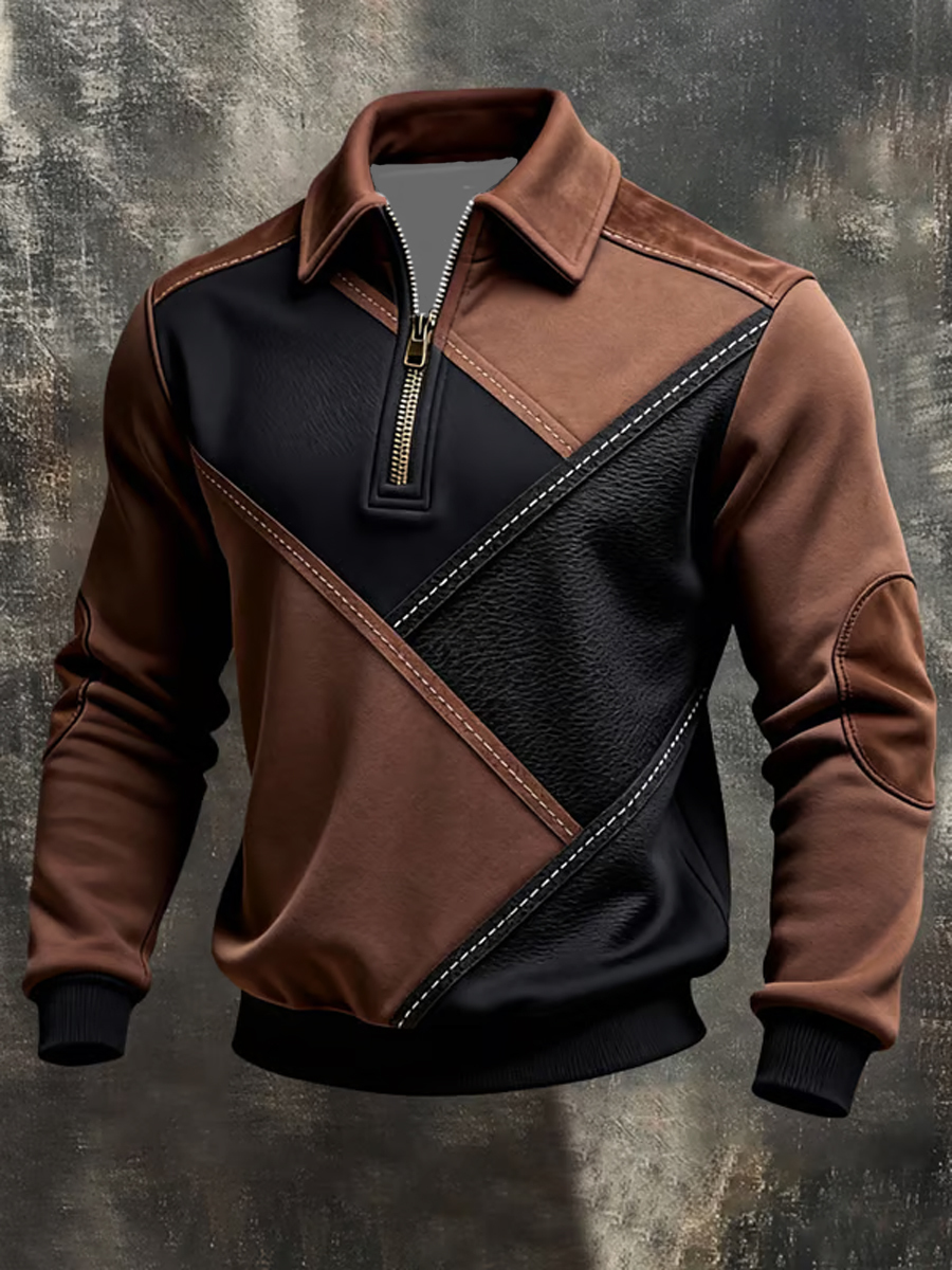 Men's Retro Color Block Print Zip-Up Sweatshirt