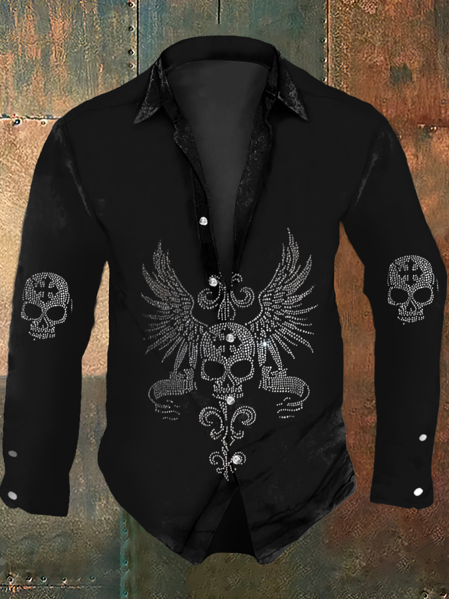 Men's Retro Halloween Party Sparkling Rhinestone Skull Faith Wings Abstract Print Casual Long Sleeve Shirt