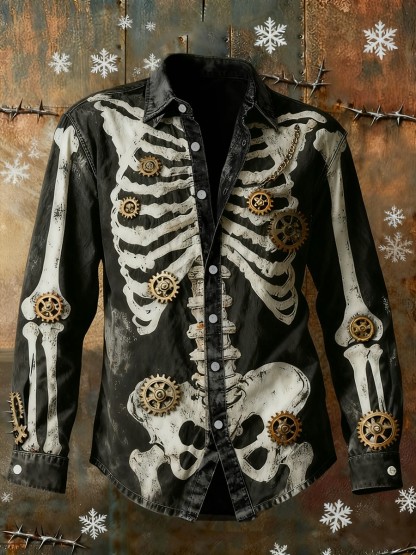 Men's Retro Halloween Skull Punk Skeleton Gear Abstract Print Casual Long Sleeve Shirt