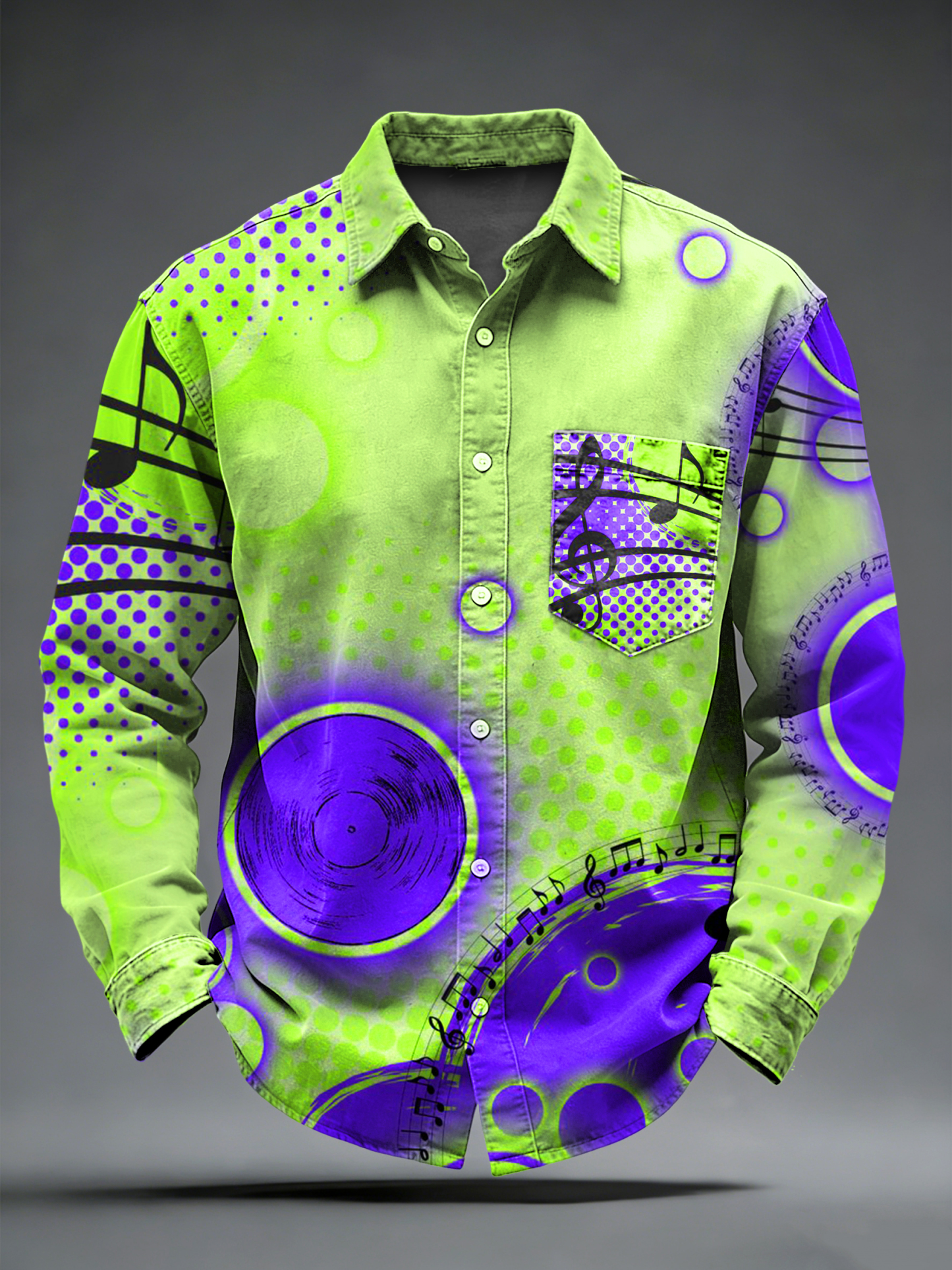 Men's Retro Music Printed Long Sleeved Pocket Shirt