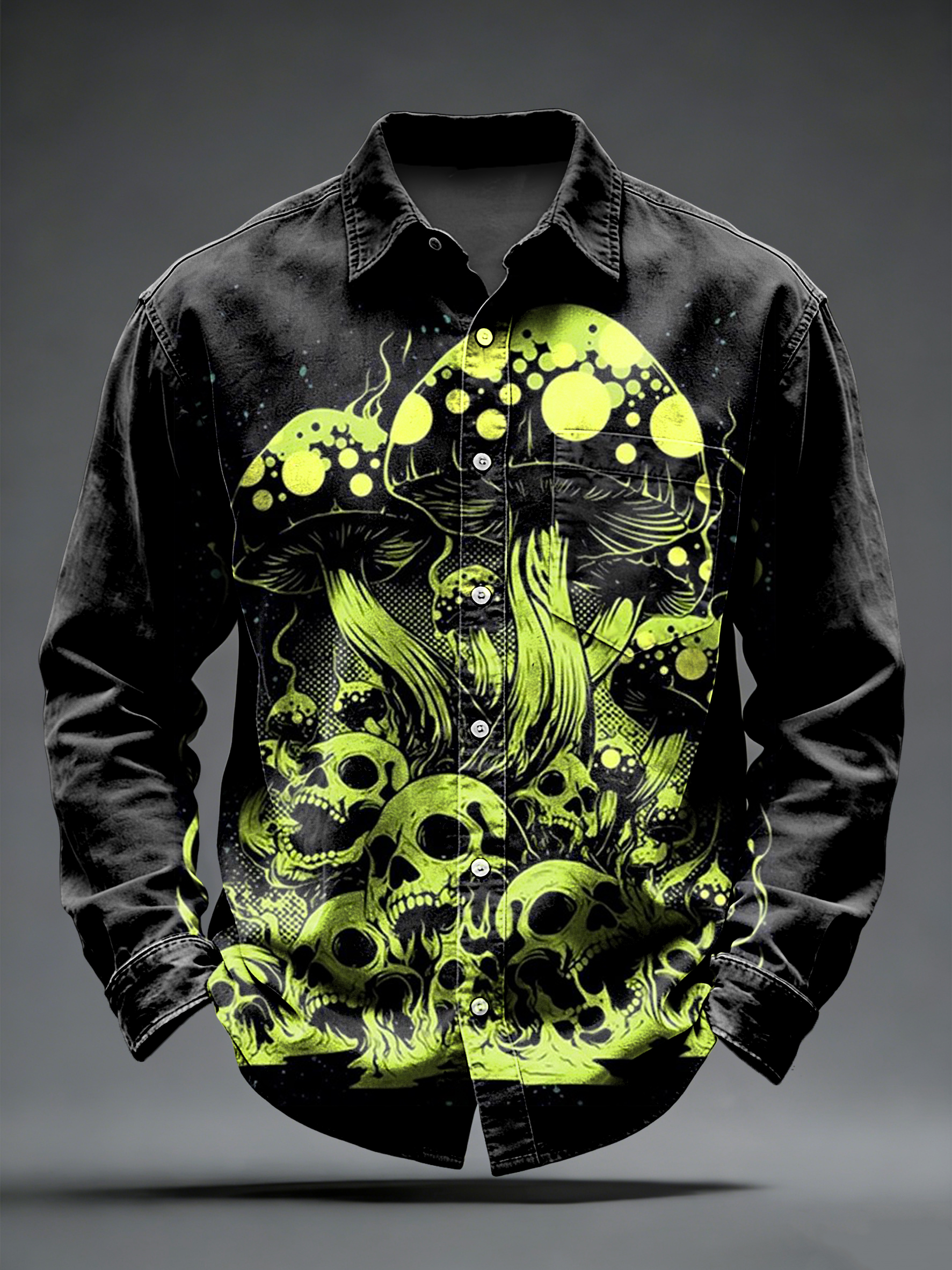 Men's Retro Psychedelic Mushroom Skull Printed Long Sleeved Pocket Shirt