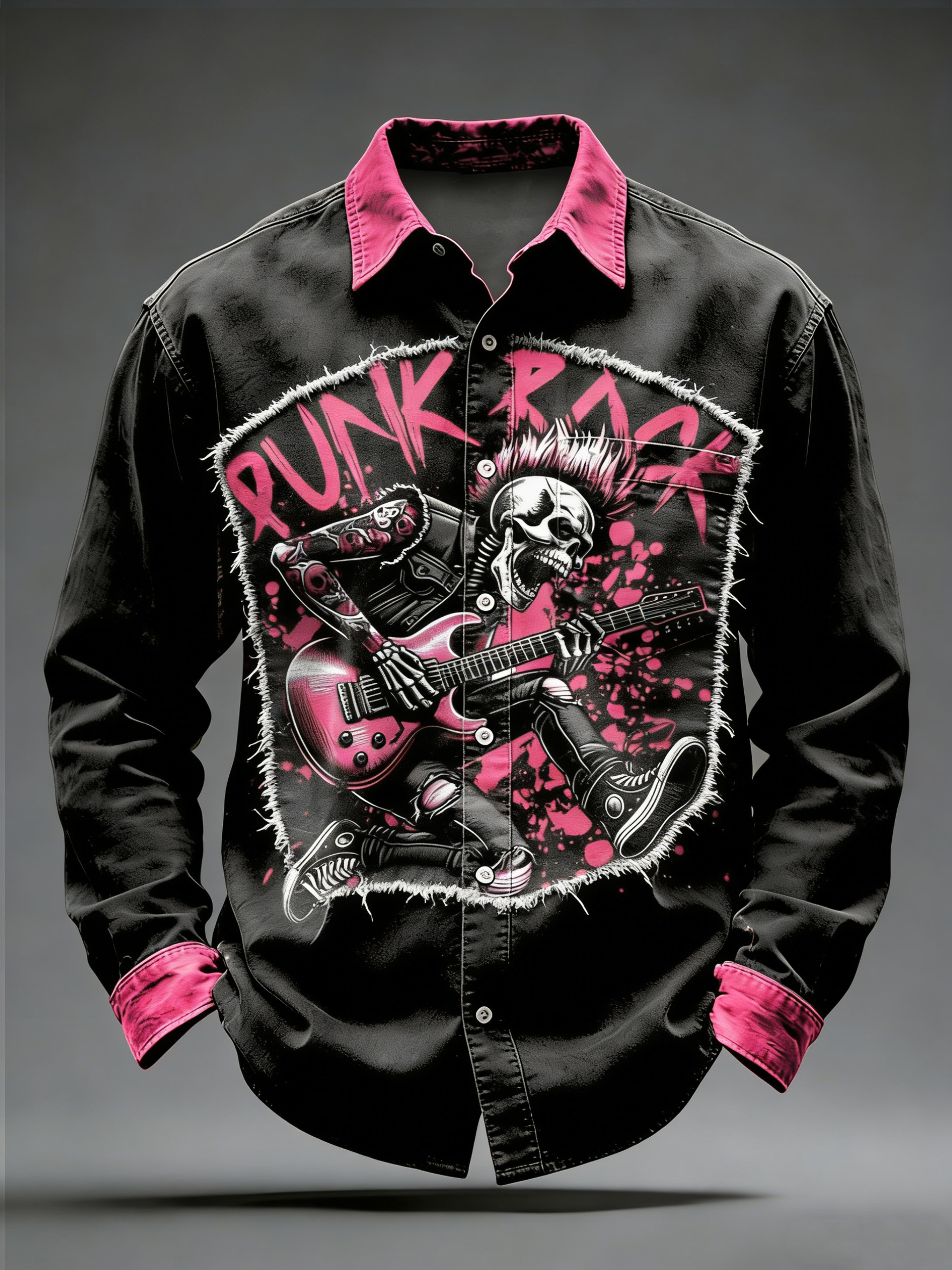 Men's Retro Punk Music Skull Printed Long Sleeved Pocket Shirt