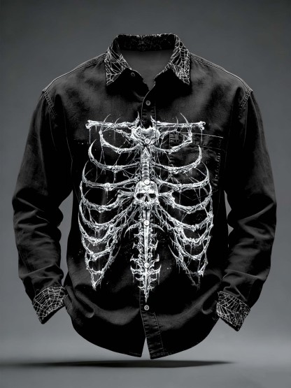 Men's Retro Punk Skeleton Printed Long Sleeved Pocket Shirt
