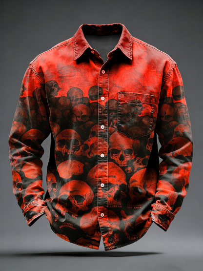 Men's Retro Skull Printed Long Sleeved Pocket Shirt