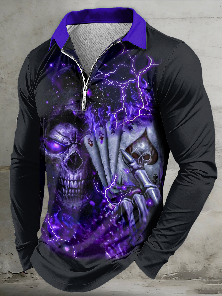 Men's Skull Printed Half Zipper Lapel Long Sleeved Polo