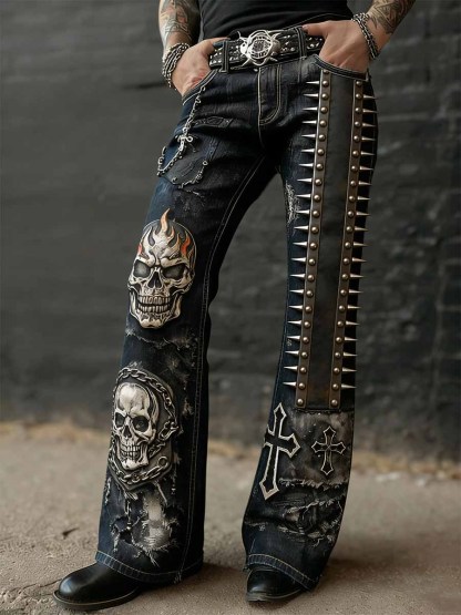 Men's Vintage Punk Rock Skull Cross Patchwork Print Comfortable Pants