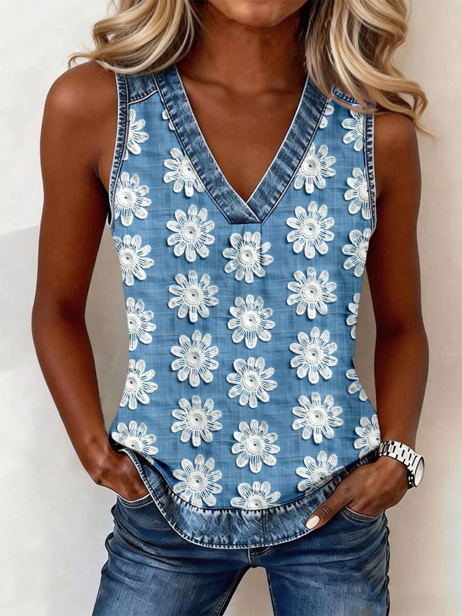 Women's Classy Floral Pattern Denim Patchwork Top