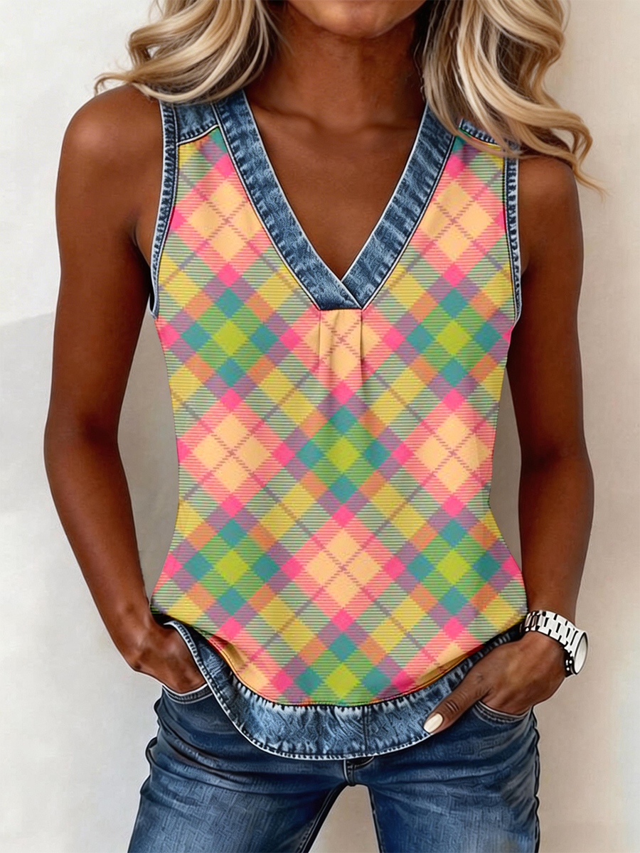 Women's Pastel Plaid Pattern Denim Patchwork Top