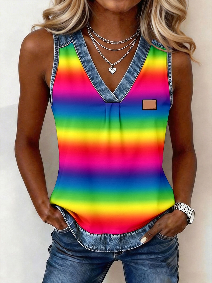 Women's Rainbow Colored Striped Print Denim Patchwork Top
