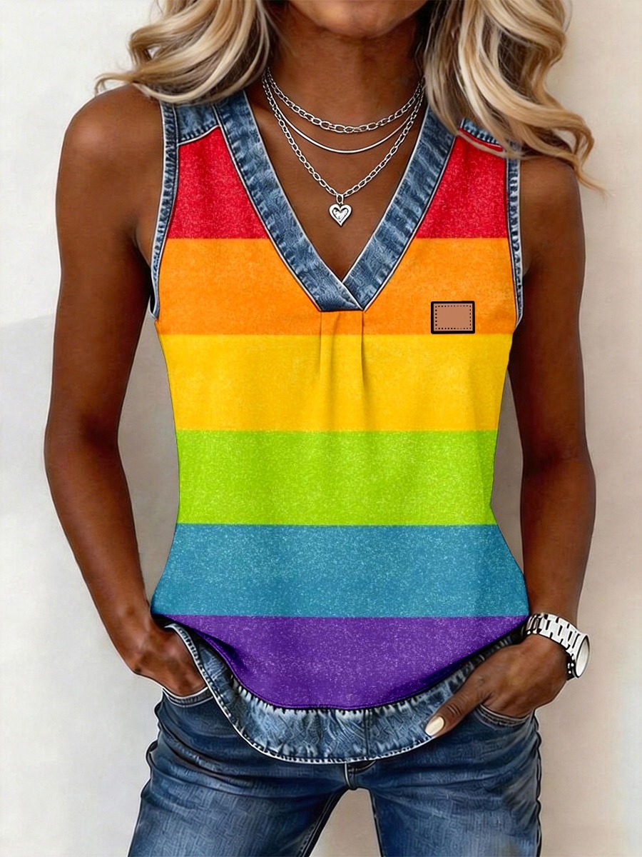 Women's Rainbow Colored Striped Print Denim Patchwork Top