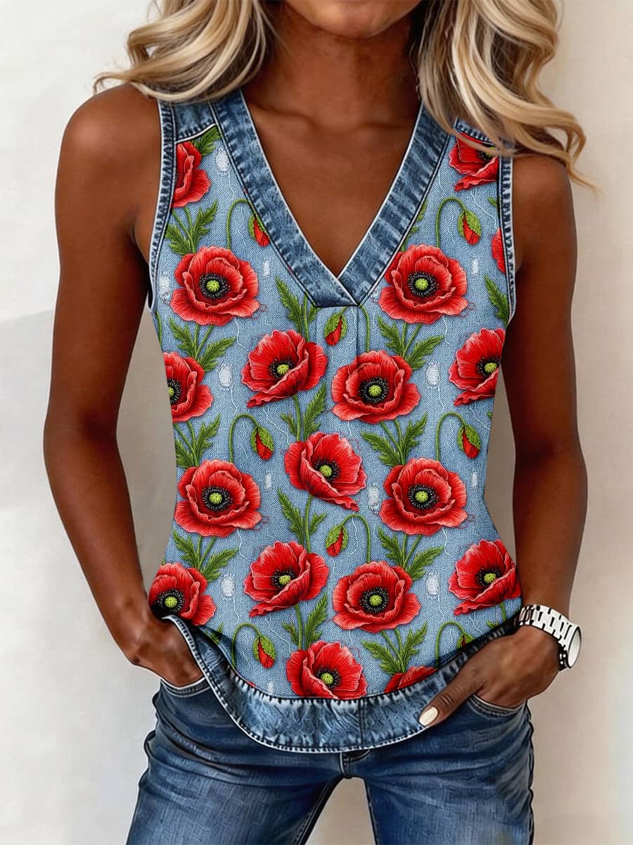 Women's Red Poppy Embroidery Pattern Denim Patchwork Top
