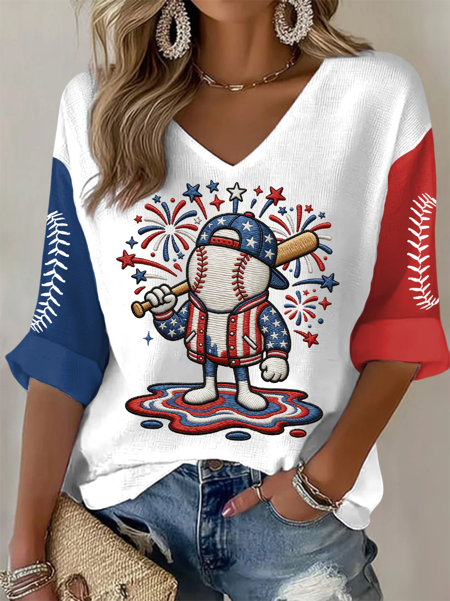 Women's USA Baseball Print Casual V-Neck Waffle Top