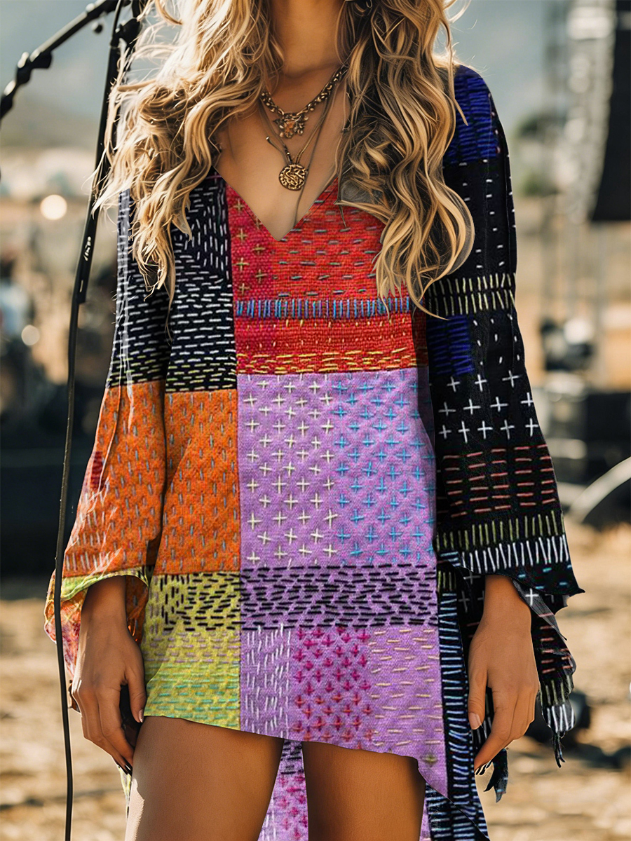 Women's Vintage Bohemia Art Print Long Sleeve Cotton Shirtdress