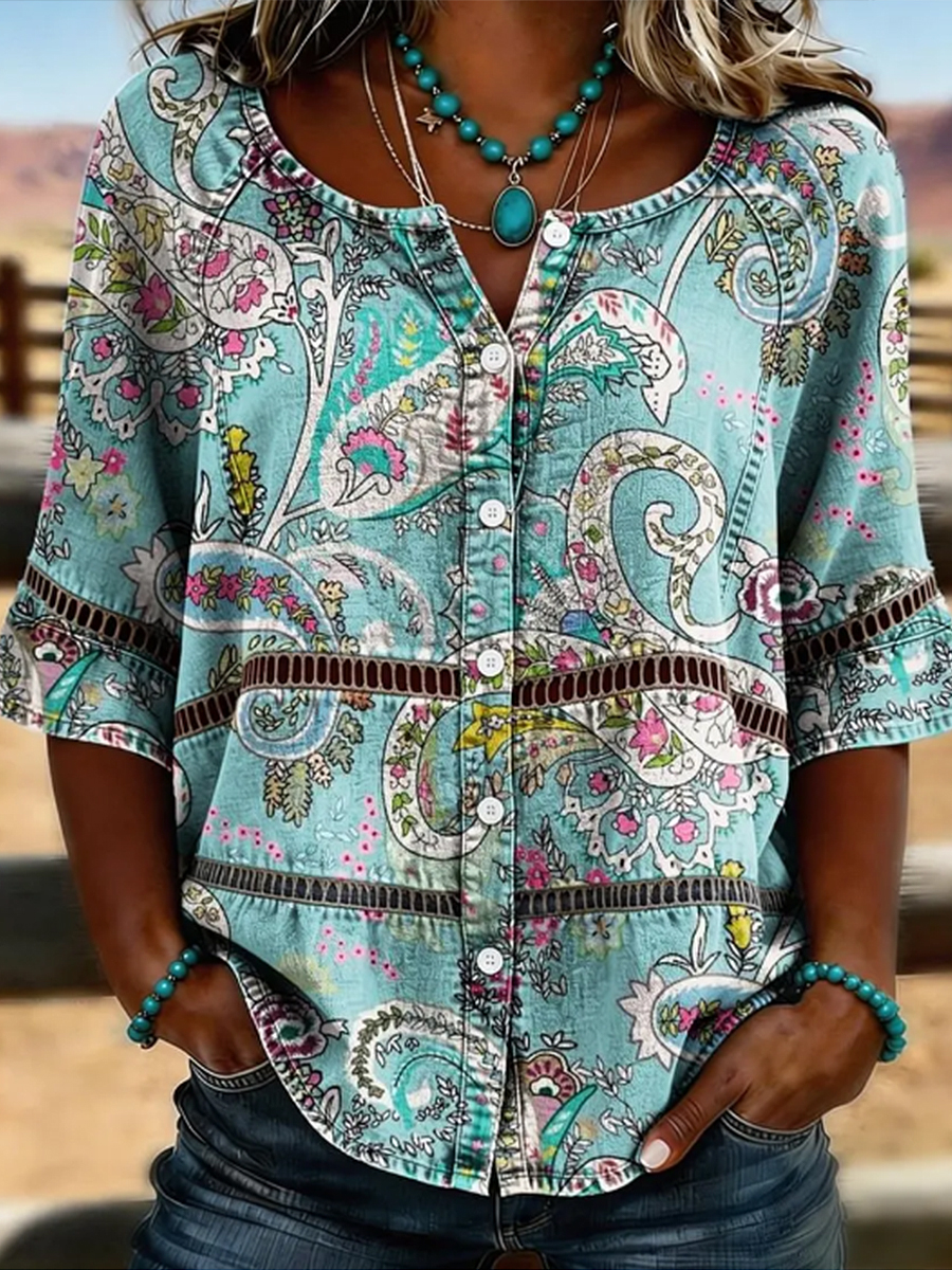 Women's Vintage Floral Print Casual Hollow-Out Shirt