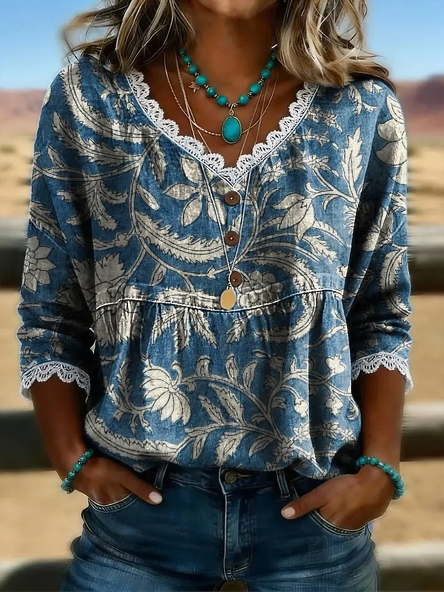 Women's Vintage Floral Print Casual Lace Splicing Shirt