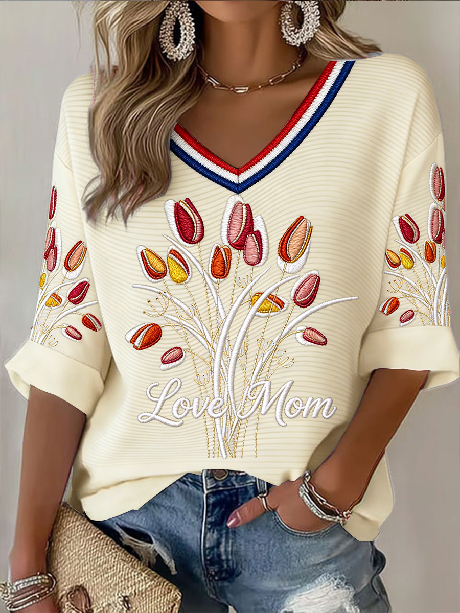 Women’s Tulip Print Mother’s Day Gift Fashion V-neck T-shirt