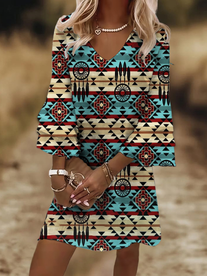 Women’s Vintage Western Colorful Aztec Dreamcatcher Print Flare Sleeve V Neck Loose Dress