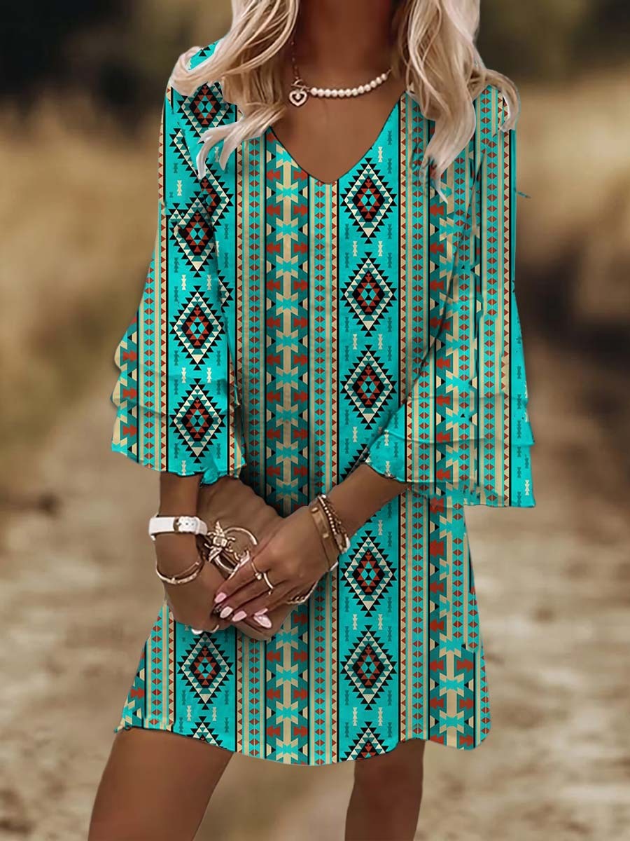 Women’s Vintage Western Colorful Aztec Nation Print Flare Sleeve V Neck Loose Dress