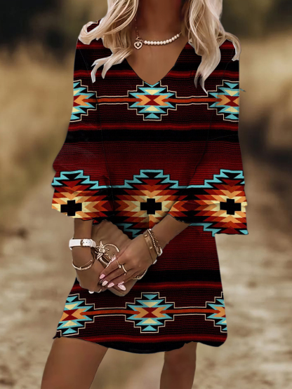 Women’s Vintage Western Colorful Aztec Print Flare Sleeve V Neck Loose Dress